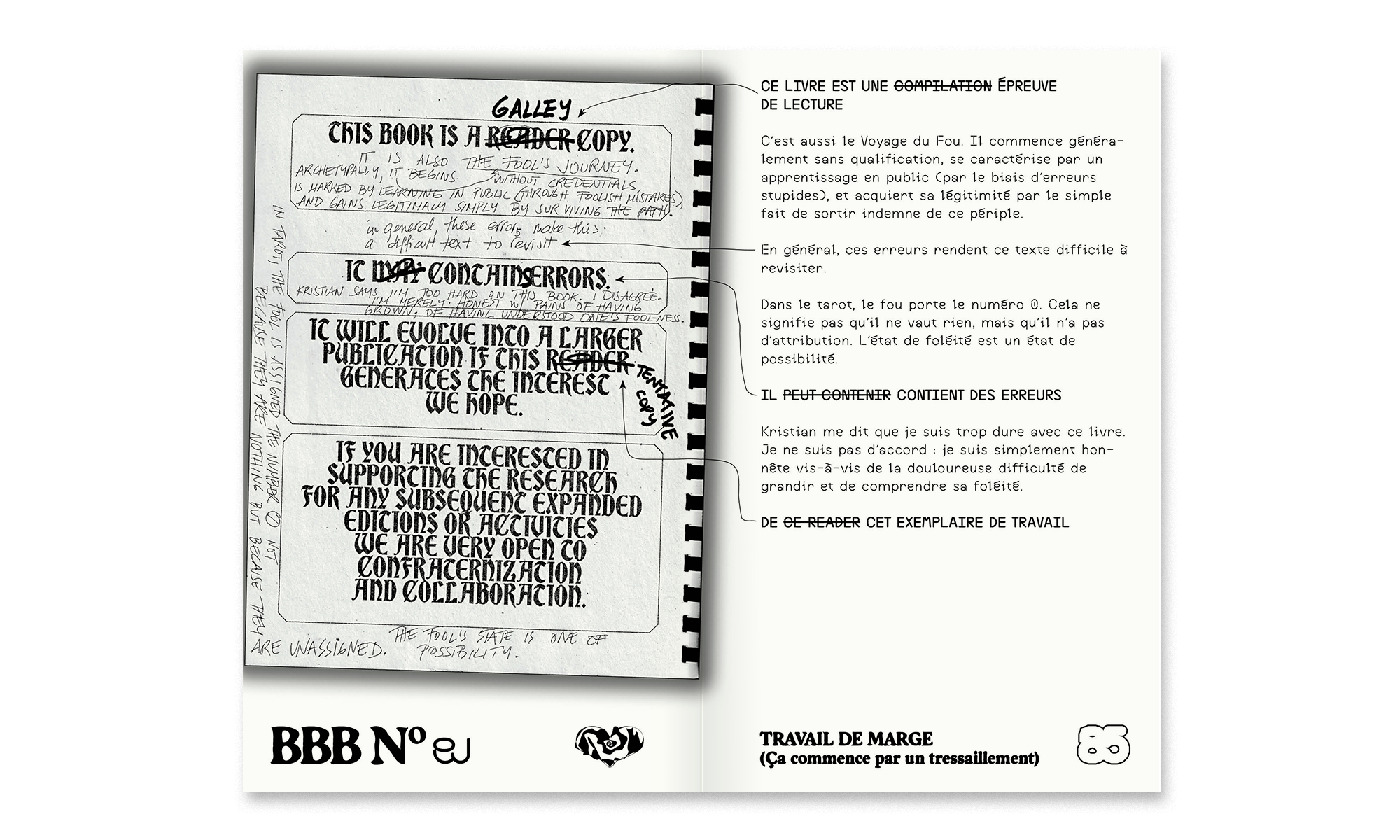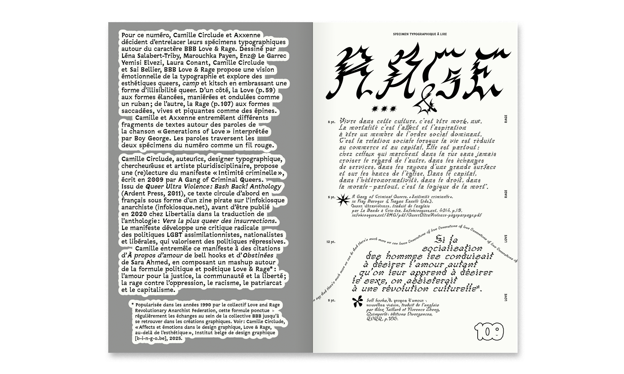 • Two typographic specimens present the typeface BBB Love & Rage through a patchwork of excerpts from texts by Boy George, Leslie Feinberg, Hélène Giannecchini, A Gang of Criminal Queers, bell hooks and Sara Ahmed.