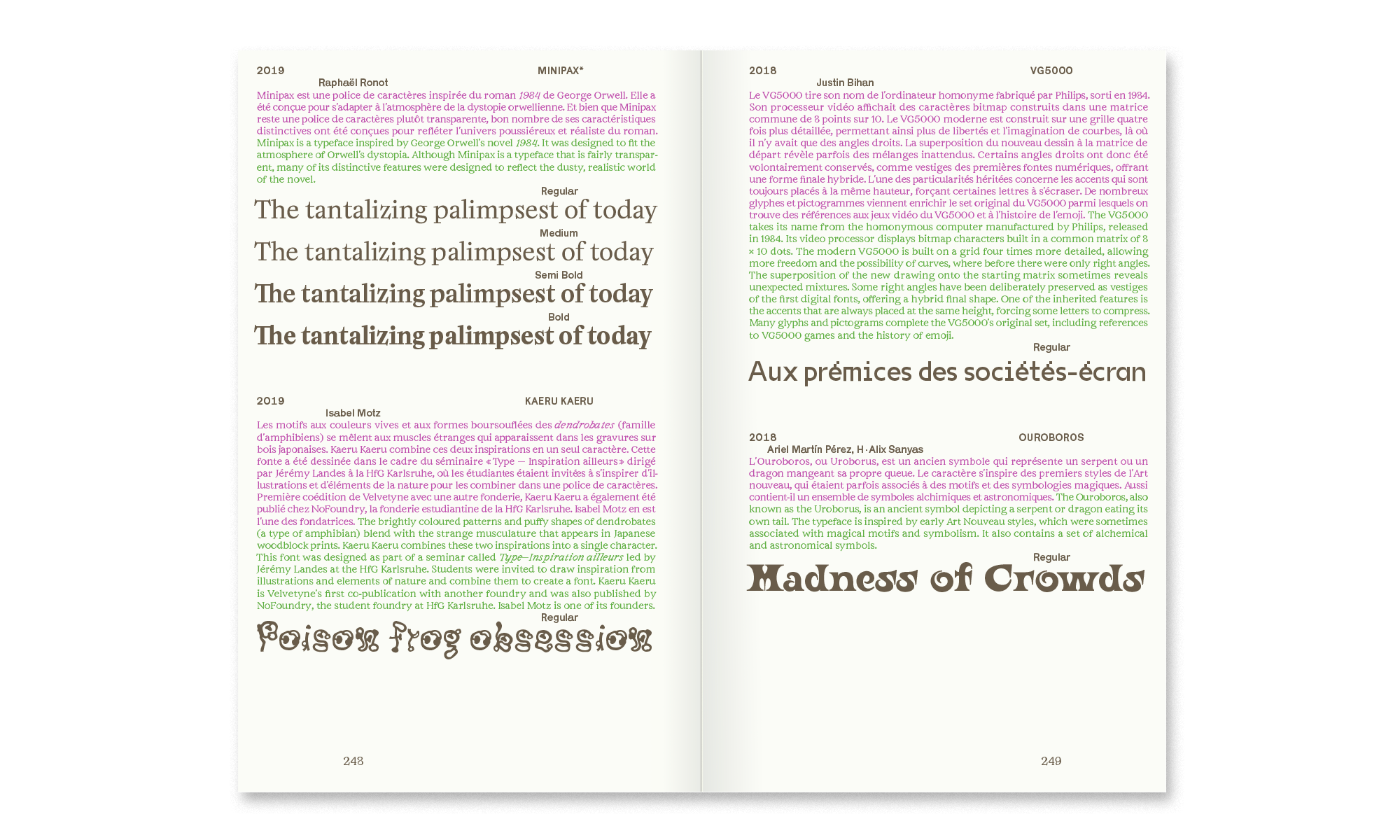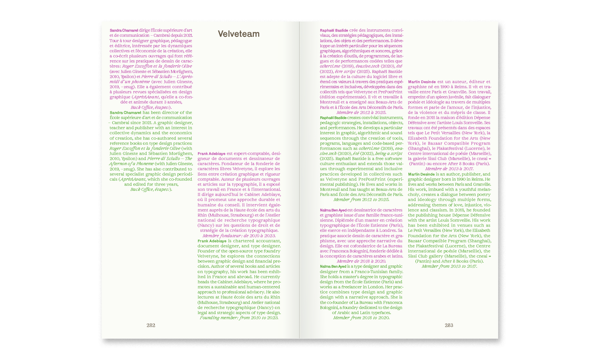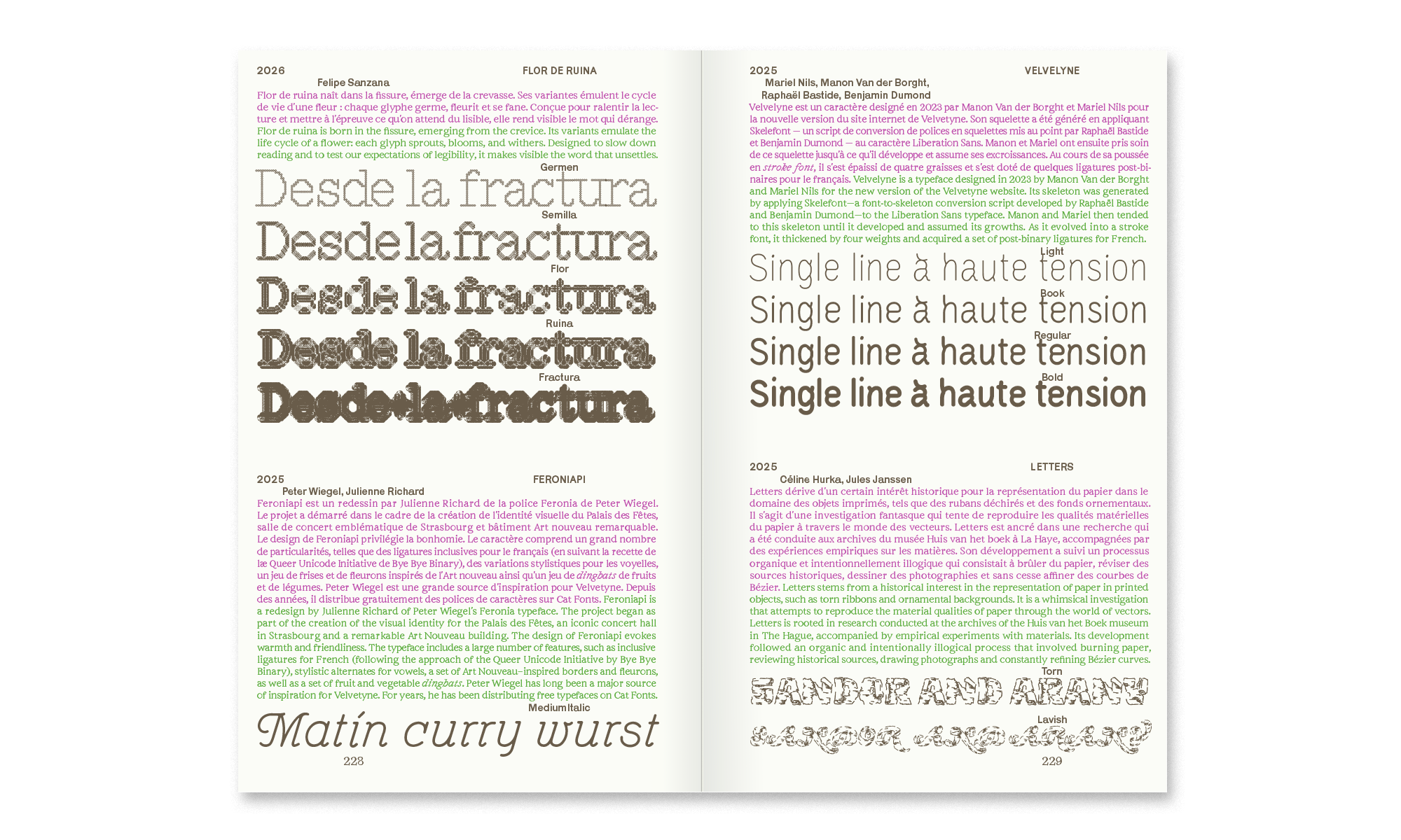 The book is structured around a polyphonic interview conducted by Sandra Chamaret with the members of the collective, a series of in-depth articles on emblematic typefaces from the foundry, as well as an exhaustive catalogue of the more than 70 fonts published by nearly as many international authors.