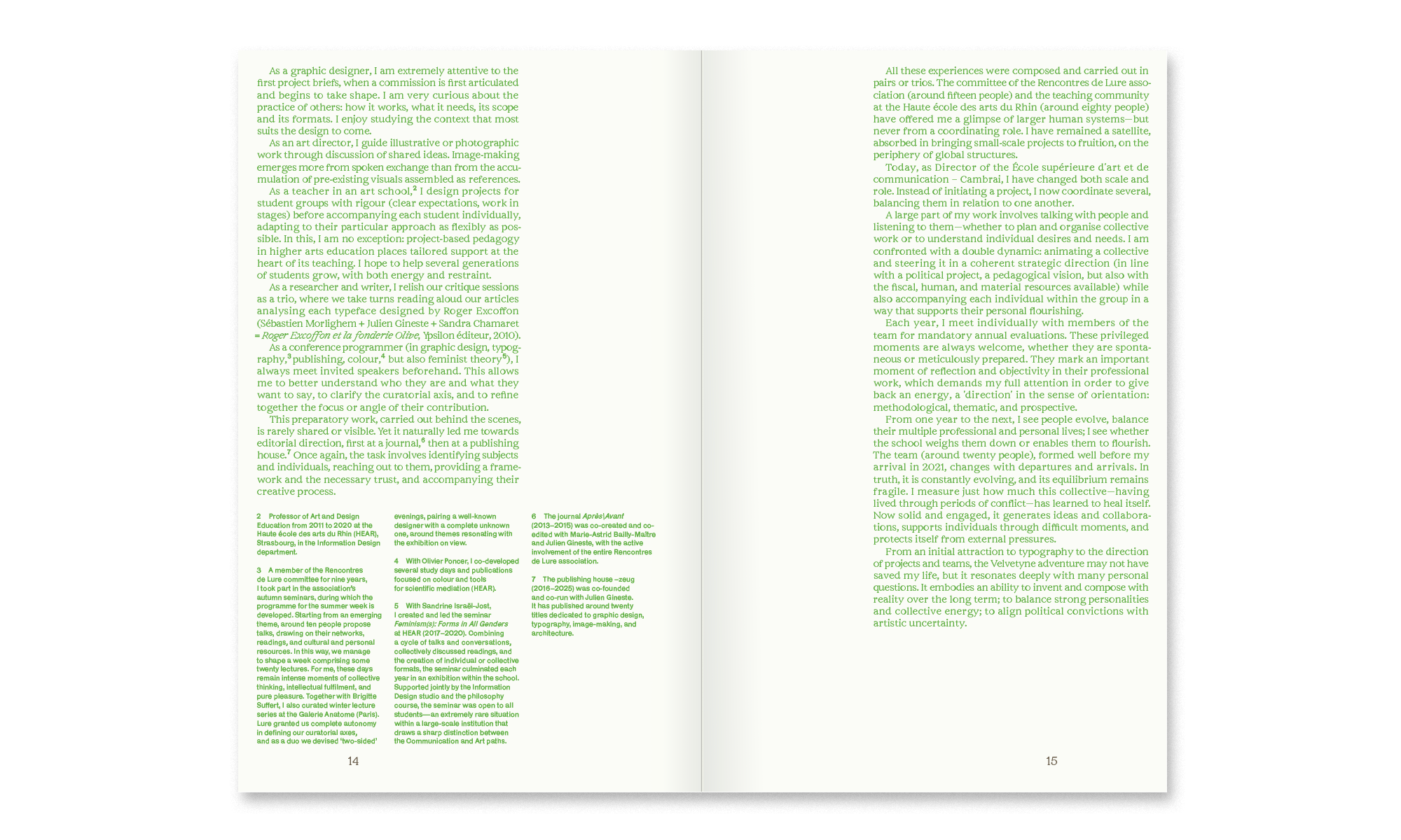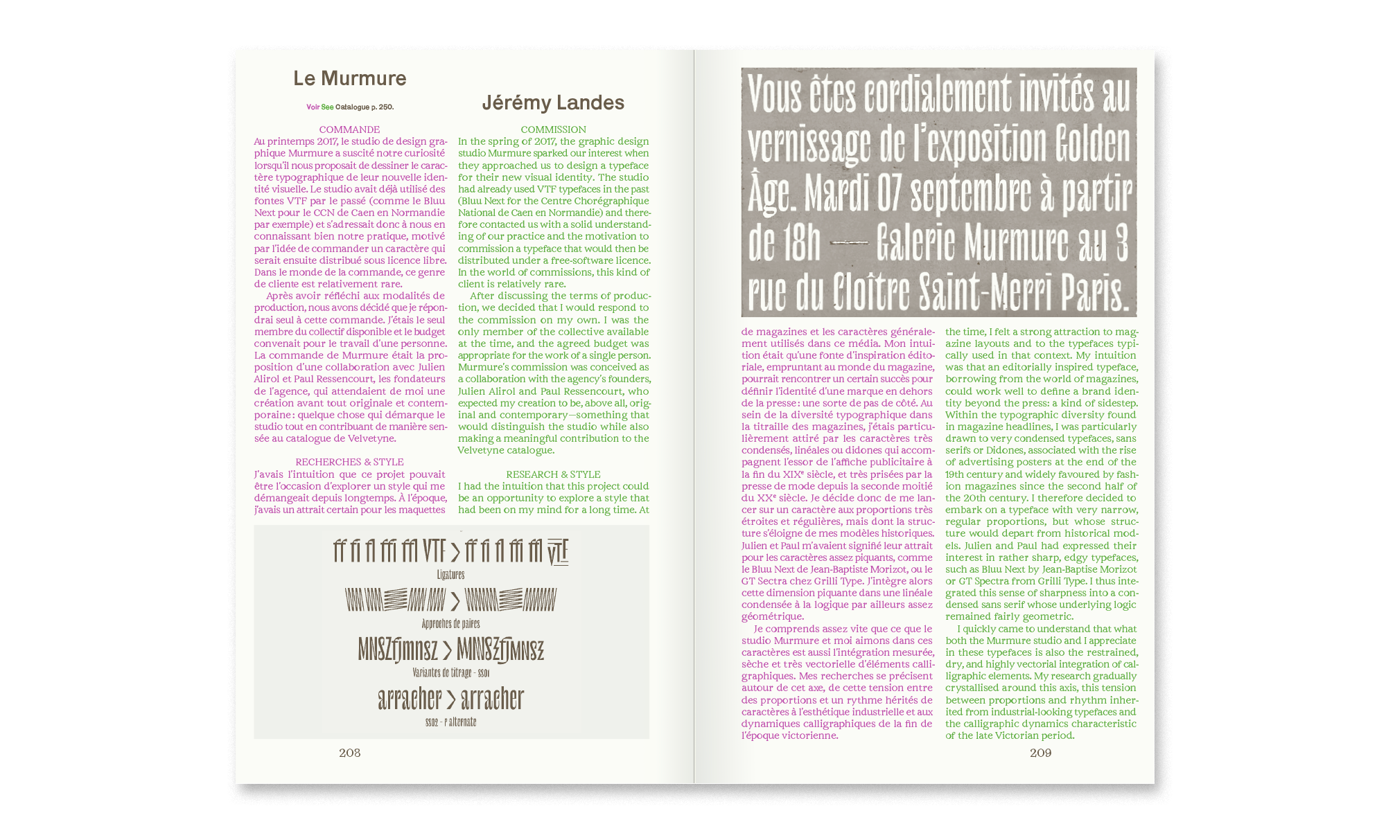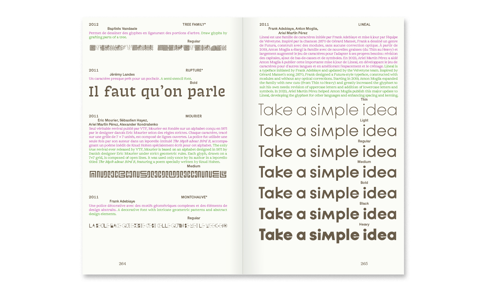 The book is structured around a polyphonic interview conducted by Sandra Chamaret with the members of the collective, a series of in-depth articles on emblematic typefaces from the foundry, as well as an exhaustive catalogue of the more than 70 fonts published by nearly as many international authors.