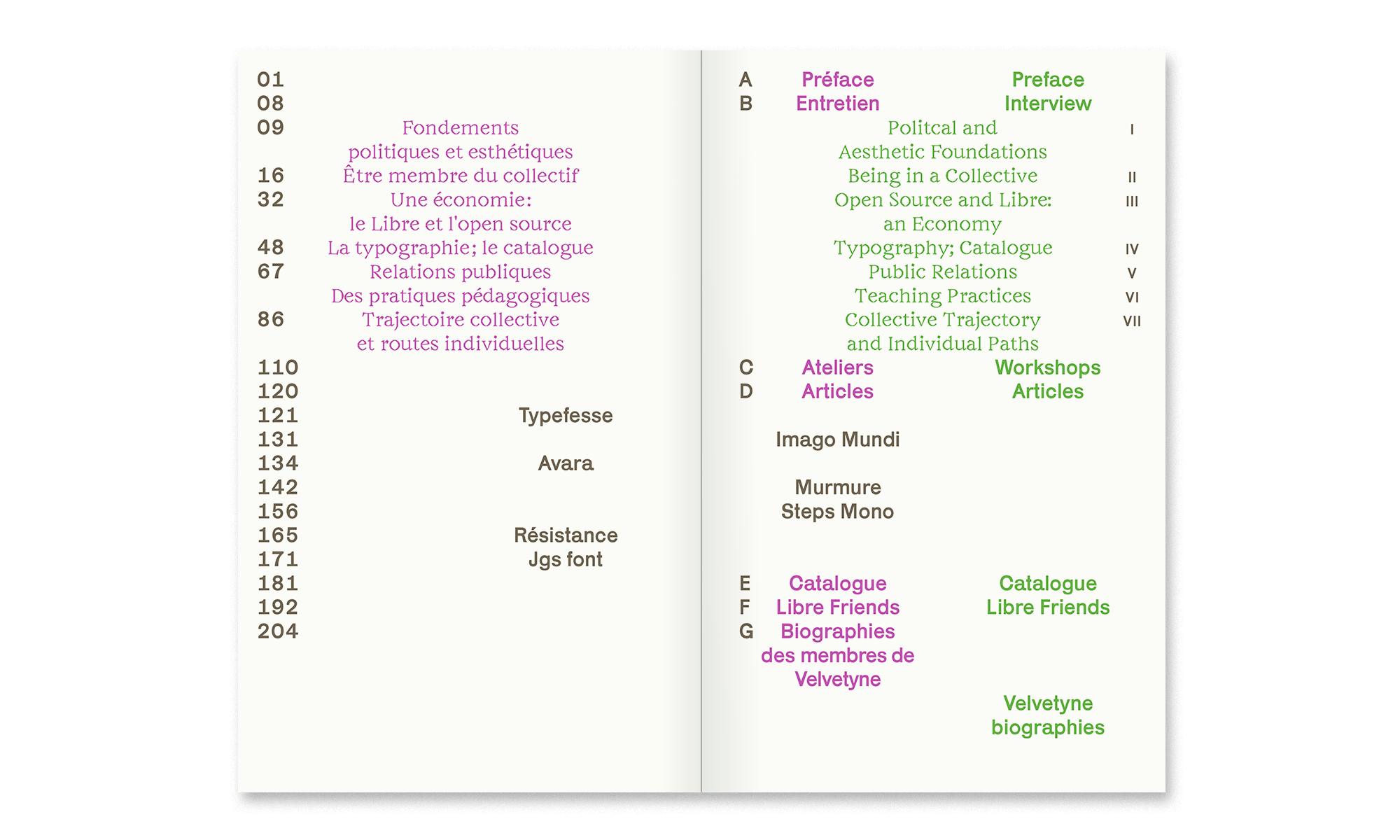 L’ouvrage s’articule autour d’un entretien polyphonique mené par Sandra Chamaret avec les membres du collectif, d’une série d’articles de fond sur des caractères emblématiques de la fonderie, ainsi que du catalogue exhaustif des plus de 70 polices publiées par presque autant d’auteur·ices internationaux·les.