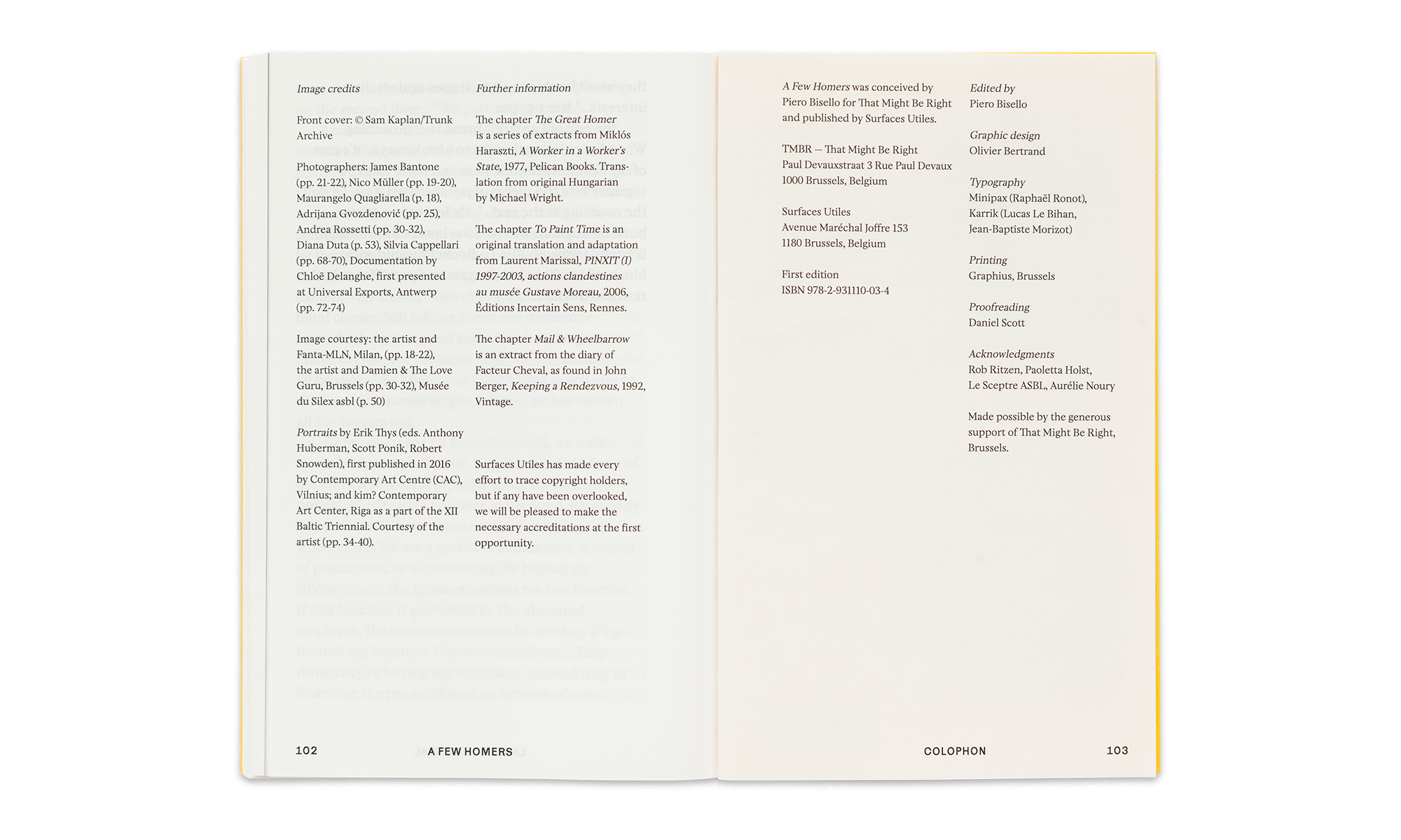 Avec les textes et contributions artistiques de Lotte Beckwé, Guillaume Boutrolle, Facteur Cheval, Miklós Haraszti, Lorenza Longhi, Emanuele Marcuccio, Laurent Marissal, Céline Mathieu, Batsheva Ross, Juan Pablo Saenz, Shervin(e) Sheikh Rezaei, Erik Thys et Bas van den Hout.