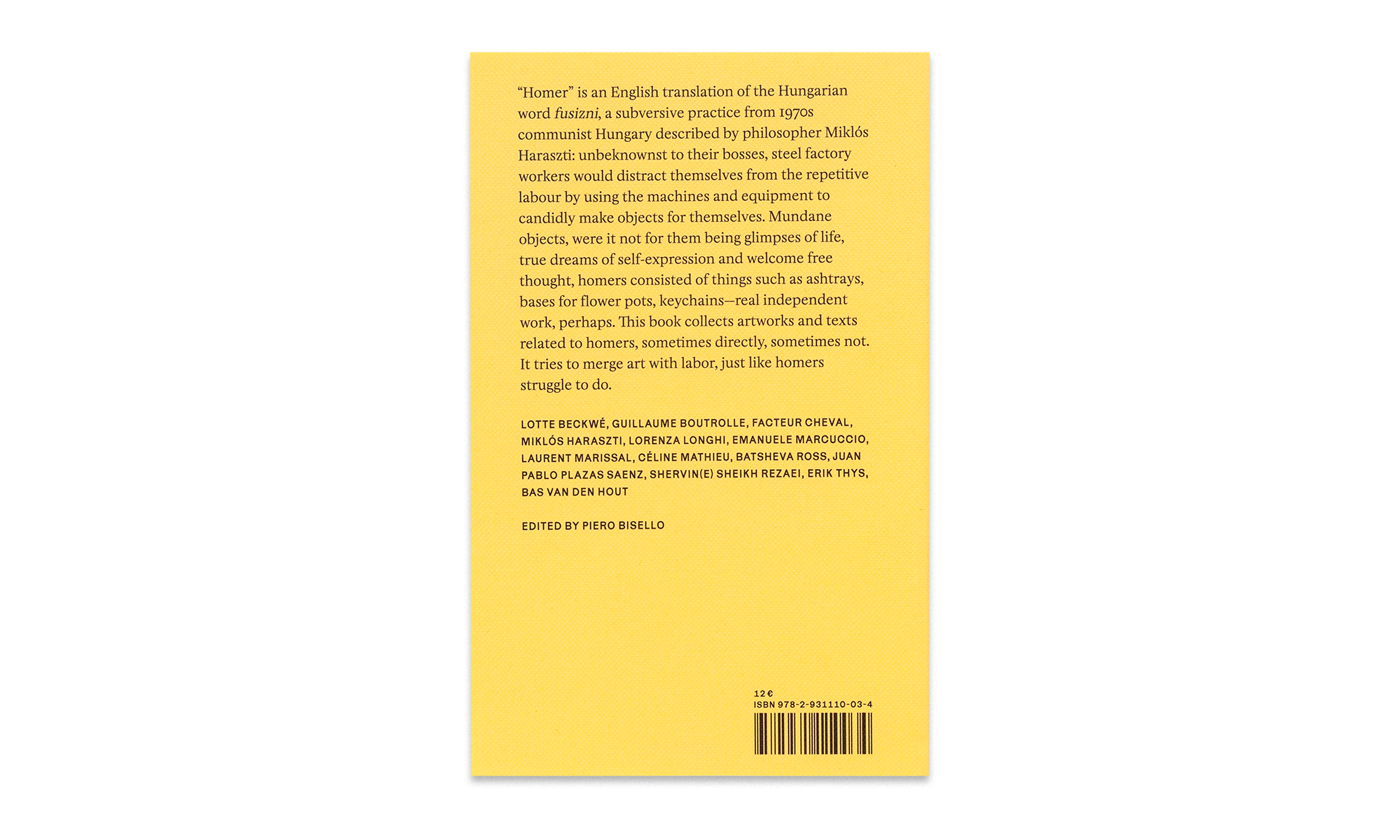 Mundane objects, were it not for them being glimpses of life, true dreams of selfexpression and welcome free thought, homers consisted of things such as ashtrays, bases for flower pots, keychains — real independent work, perhaps. This book collects artworks and texts related to homers, sometimes directly, sometimes not. It tries to merge art with labor, just like homers struggle to do.