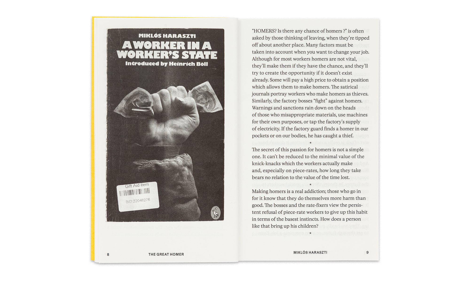 “Homer” is an English translation of the Hungarian word fusizni, a subversive practice from 1970s communist Hungary described by philosopher Miklós Haraszti: unbeknownst to their bosses, steel factory workers would distract themselves from the repetitive labour by using the machines and equipment to candidly make objects for themselves.