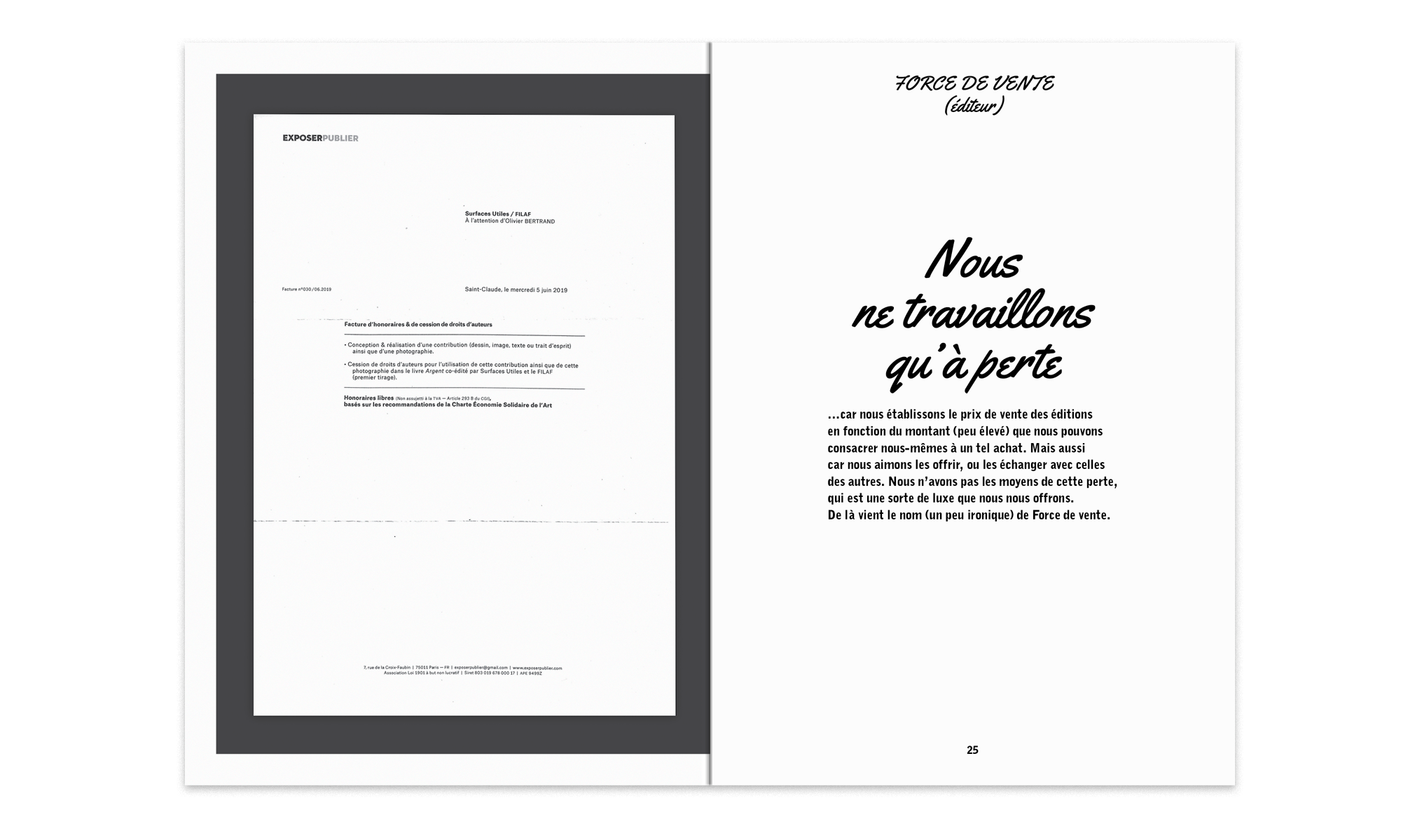 This book is co-published by FILAF and Surfaces Utiles and it reproduces the variety of materials collected in-situ, with the contributions of: antoine L-lefebvre editions, Raymond Pettibon, Élias Sanbar, force de vente, François Chaslin, Laurent Baridon, ExposerPublier, Éric Mangion, Jean-Michel Frodon, Jacqueline Caux, Sébastien Planas, Thomas Clerc, Callisto Mc Nulty, Grégoire Pujade-Lauraine, Juliana Stoppa, Benjamin Blackwood, Alessandra Galletta, David Max Horowitz, Wintringer and Laura Morsch-Kihn.
