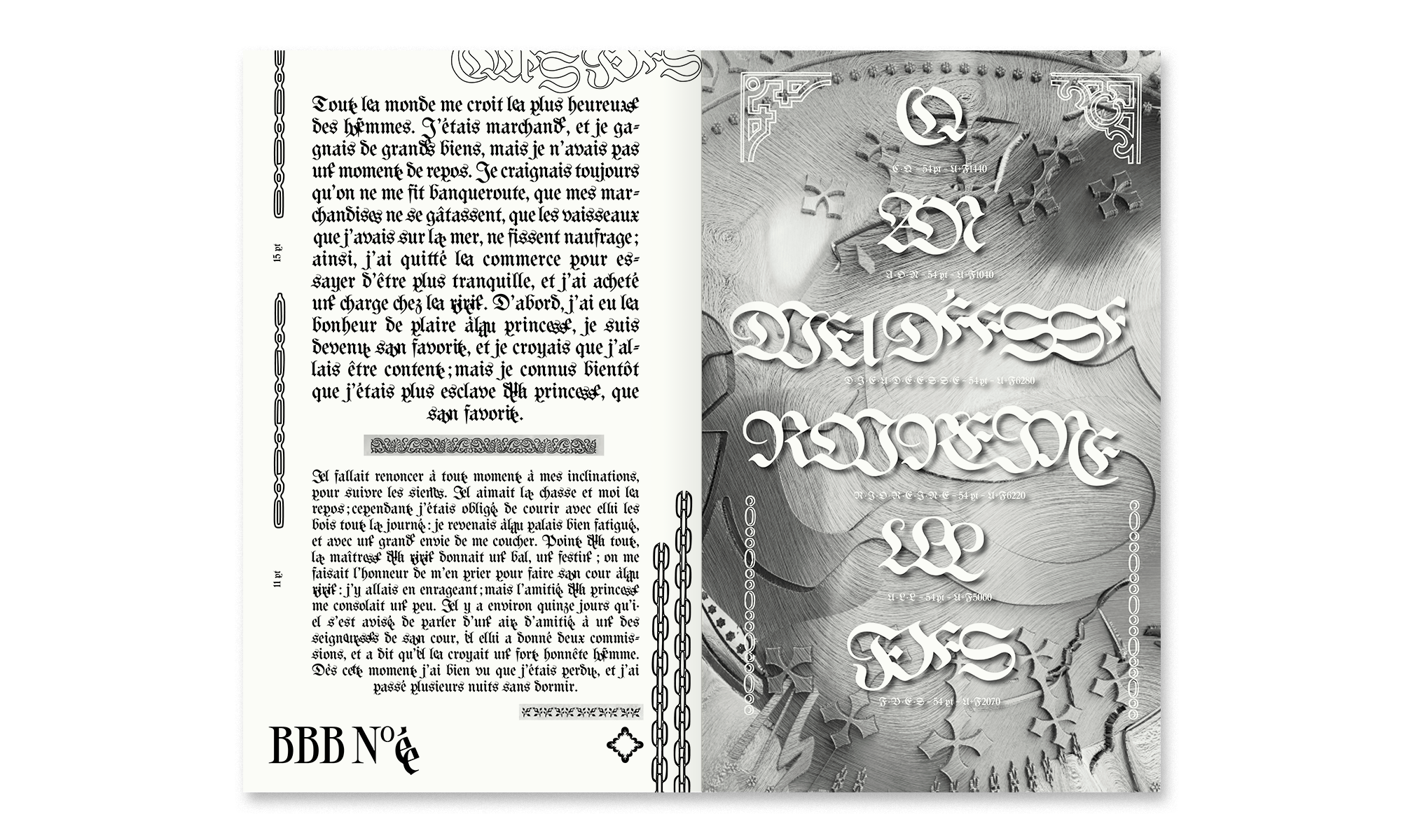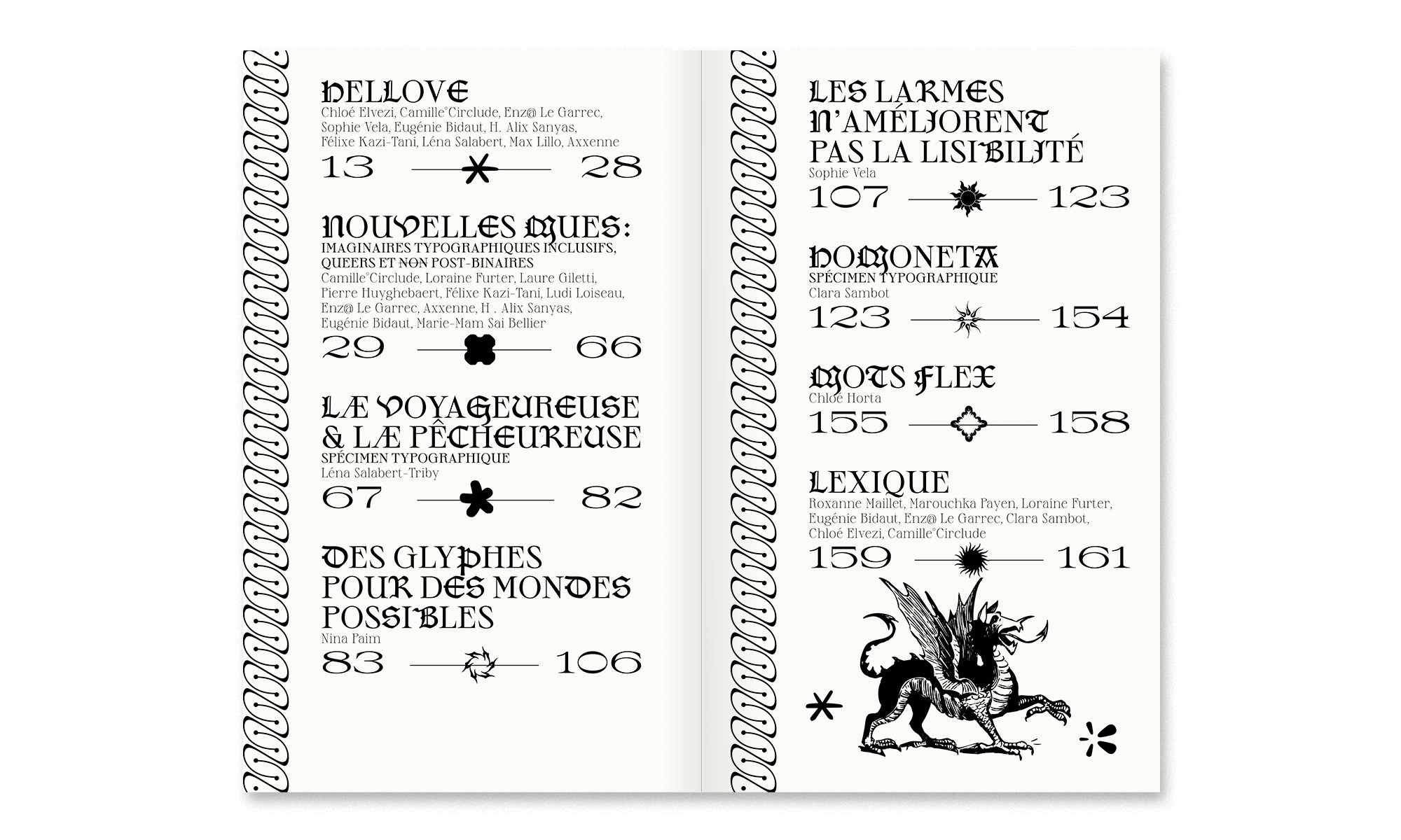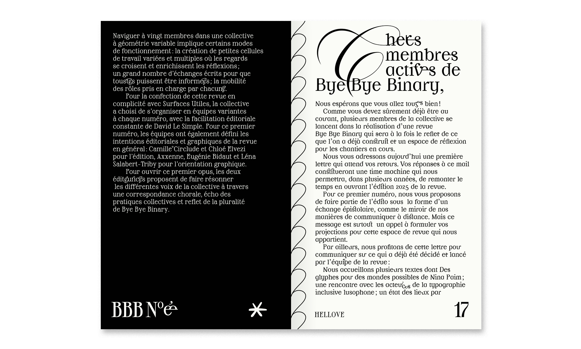 • two graphic presentations of the formal liberties taken by the collective to interweave glyphs in a post-binary perspective. Clara Sambot and Léna Salabert Triby display the full potential of the typefaces designed by the collective.