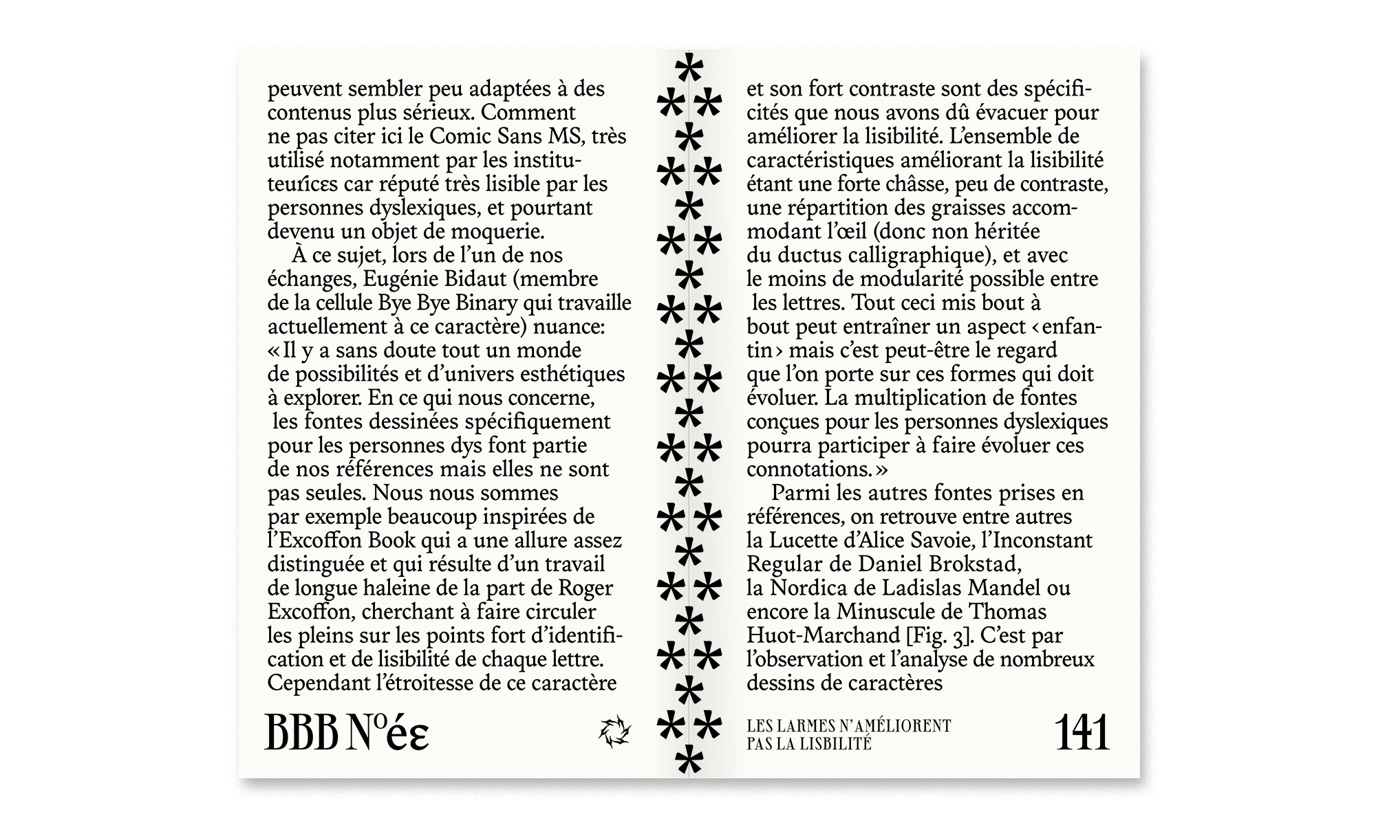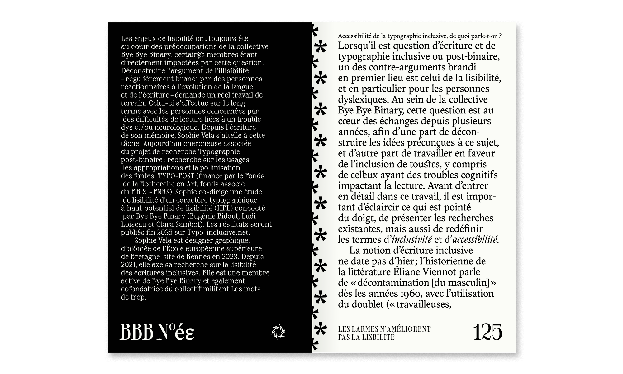 • a text by Sophie Vela looks at the accessibility of post-binary typography and sets out the issues at stake in the study launched by the author into its legibility;