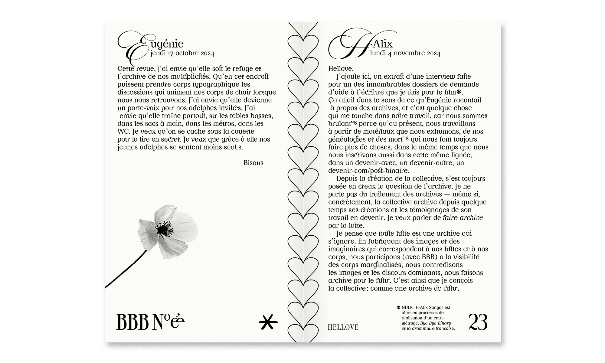 In the editorial, the members of Bye Bye Binary set out their intentions for the magazine: to be a place of resources and advice, a space for words and emotions, for exploration, for relationships, for repair, for demonstrating post-binary typography: “Our lives are fragile, like our ligatures, like our fleeting grammars, we don’t know what we’re inventing, but we know that it’s beyond us, that it’s for us and beyond.”