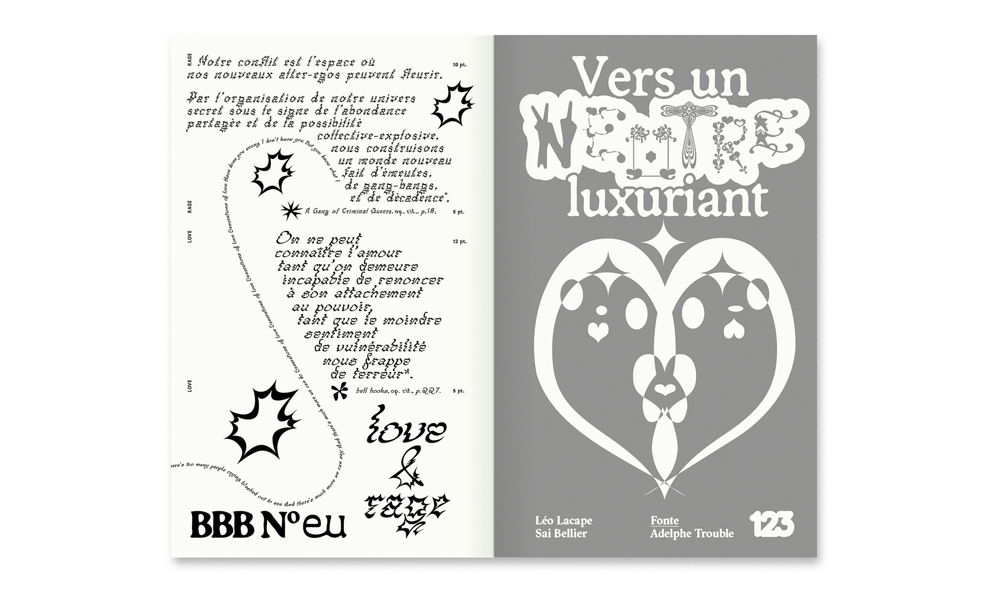 • Two typographic specimens present the typeface BBB Love & Rage through a patchwork of excerpts from texts by Boy George, Leslie Feinberg, Hélène Giannecchini, A Gang of Criminal Queers, bell hooks and Sara Ahmed.