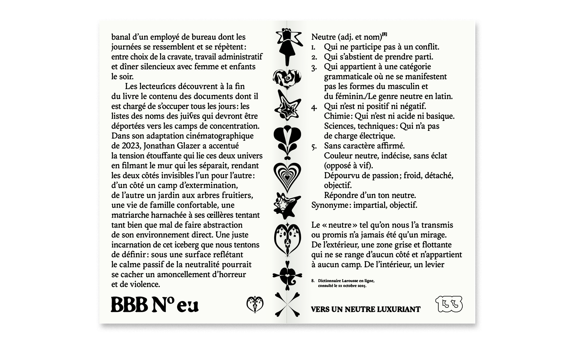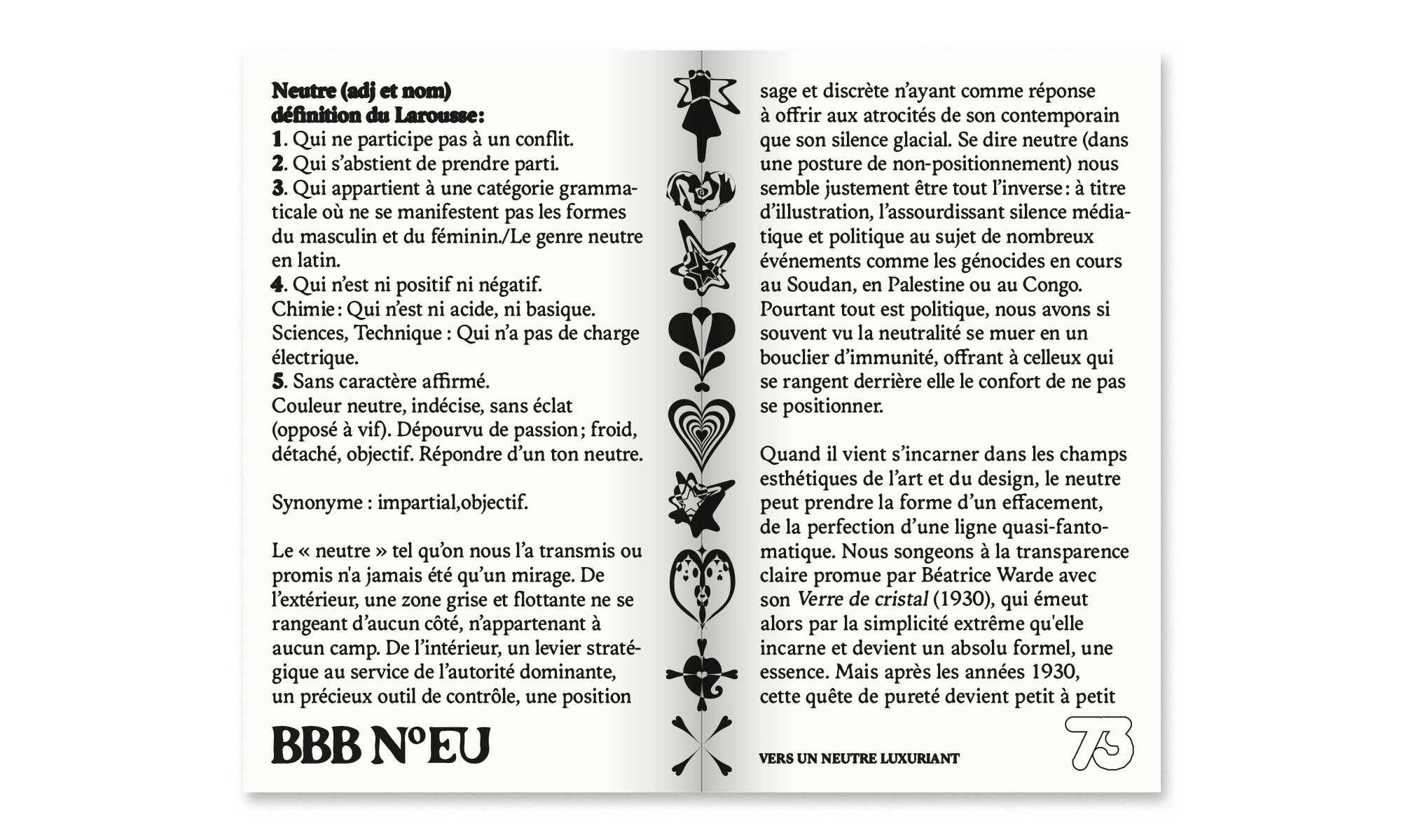 • Sai Bellier et Leœ Lacape proposent un manifeste pour un neutre typographique queer et décolonial en interrogeant les occurrences du maximalisme et de l’ornement dans l’histoire de l’art, du design et de la culture populaire face à un héritage moderniste omniprésent ;