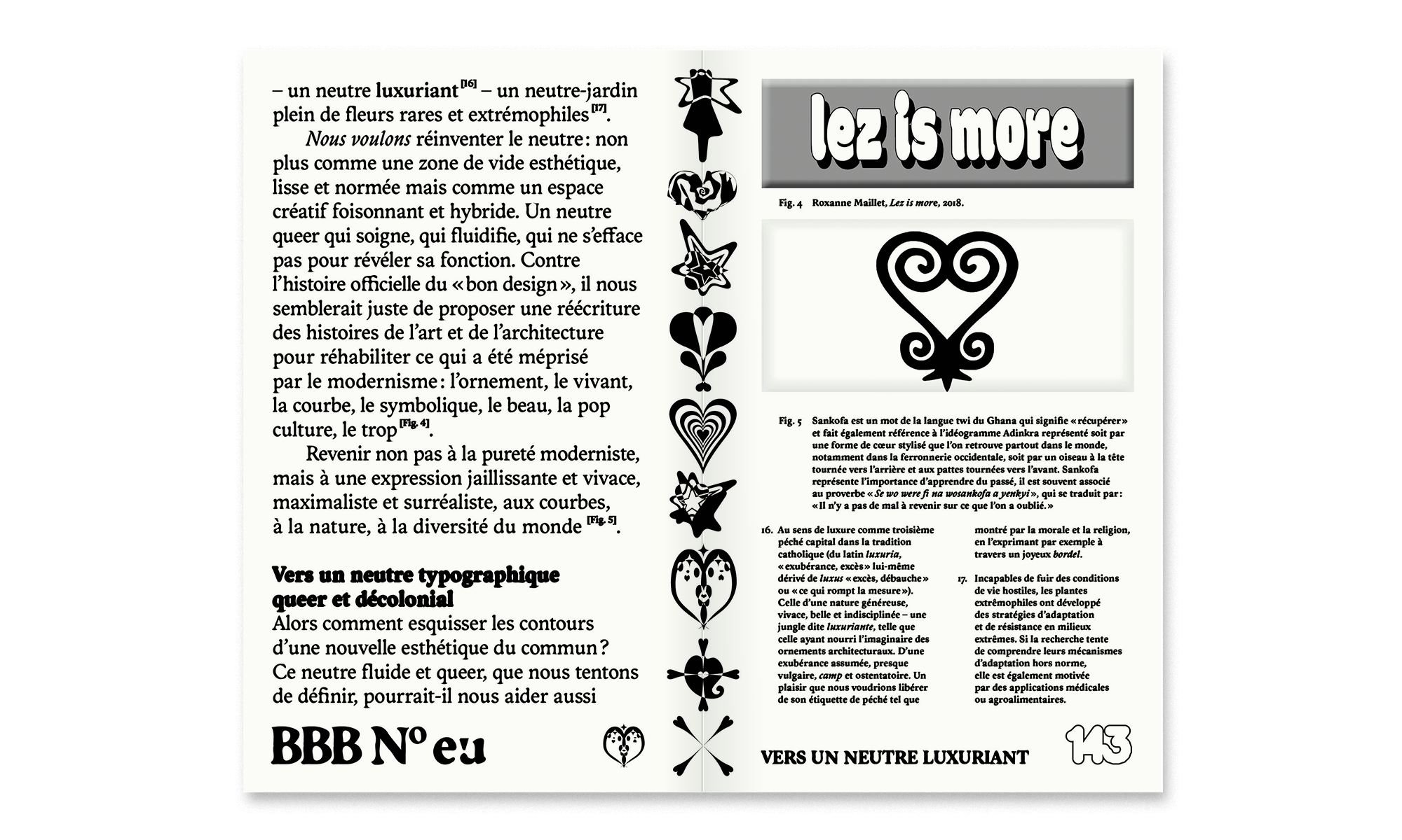 • Sai Bellier and Leœ Lacape propose a manifesto for a queer and decolonial typographic neutral, questioning occurrences of maximalism and ornament in the history of art, design, and popular culture in the face of an omnipresent modernist heritage;
