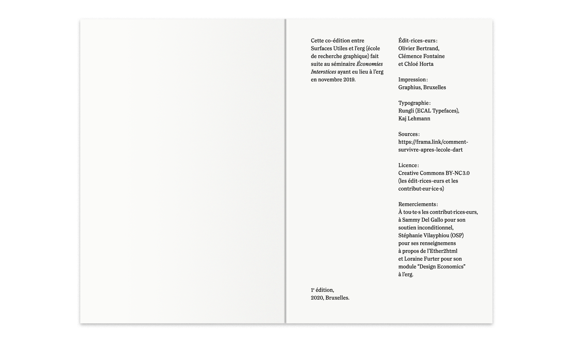 Cette co-édition entre Surfaces Utiles et l’erg (école de recherche graphique, Bruxelles) fait suite au séminaire Économies Interstices ayant eu lieu à l’erg en novembre 2019.