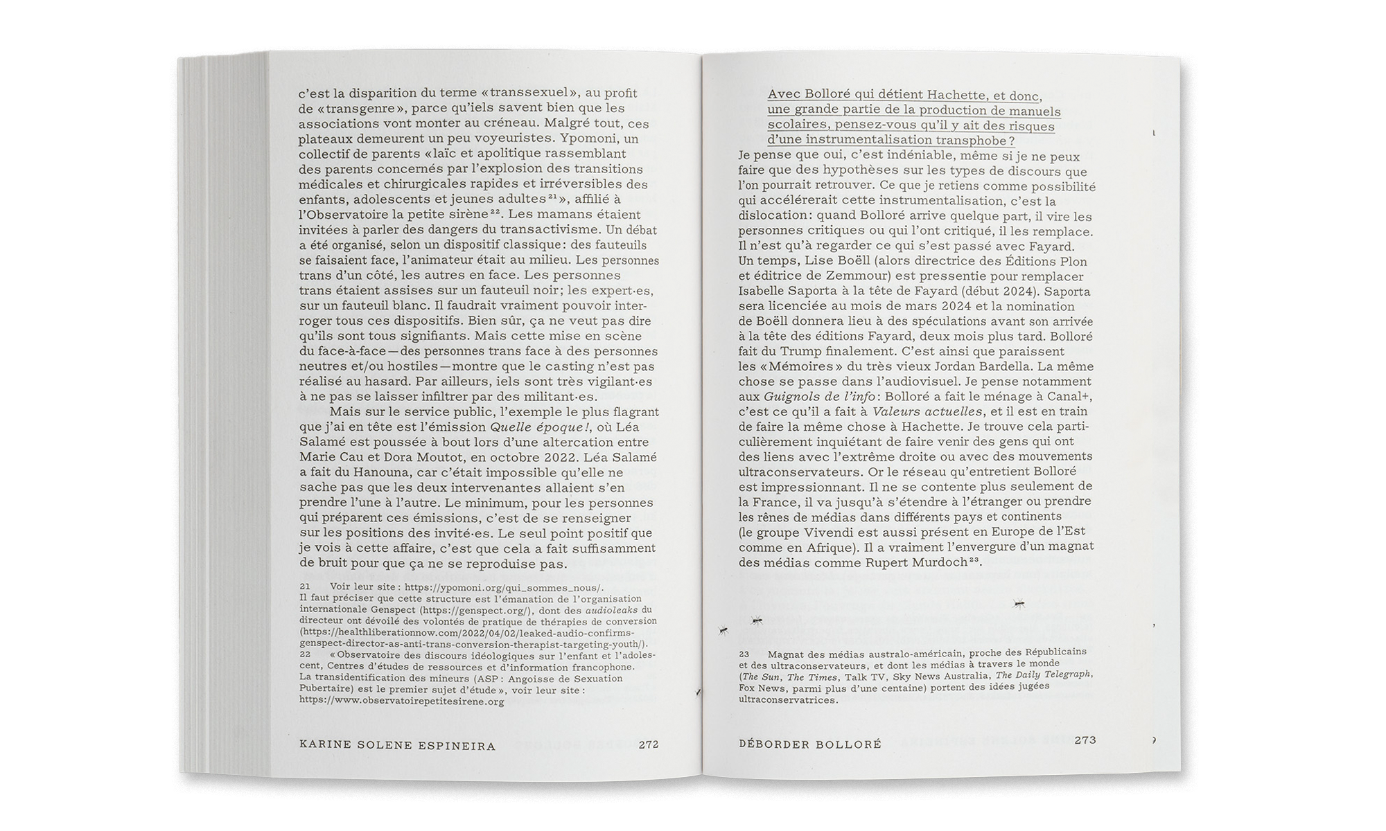 En tant qu’éditeurices indépendant·es, nous sommes indirectement visé·es par le projet totalisant de Bolloré car nos structures sont des espaces qui permettent la fabrique de contre-récits et la circulation de voix minoritaires. Face à de grands groupes monopolistiques qui filtrent les récits, il nous faut lutter pour préserver ces espaces essentiels de résistance et qui — n’en déplaise aux prophètes·ses du « grand remplacement » et aux croyant·es du « lobby LGBTQ+ » — se font rares.