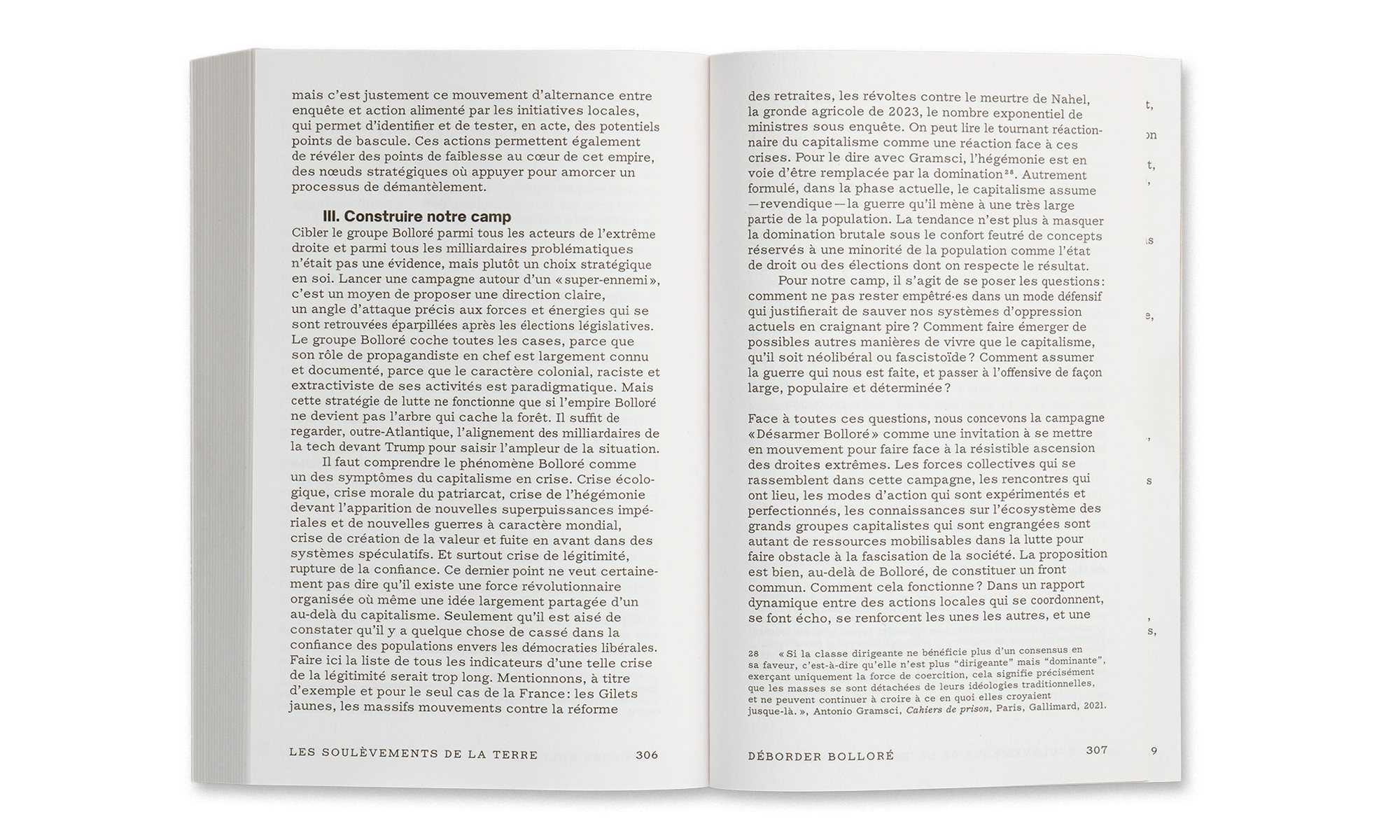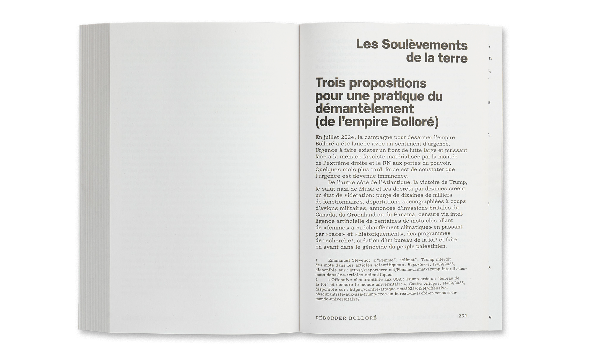 La forme de cette publication multiformat part du constat suivant : si, à lui seul, Vincent Bolloré se montre capable de mobiliser des moyens logistiques et médiatiques colossaux pour mener sa « guerre civilisationnelle », alors nous devons, de notre côté, mobiliser l’entièreté de notre réseau d’éditeurices, de diffuseurs, de libraires et de relais médiatiques pour y résister. Face à la concentration par les grands groupes, faisons jouer la multiplicité et la singularité caractéristique du monde du livre indépendant.