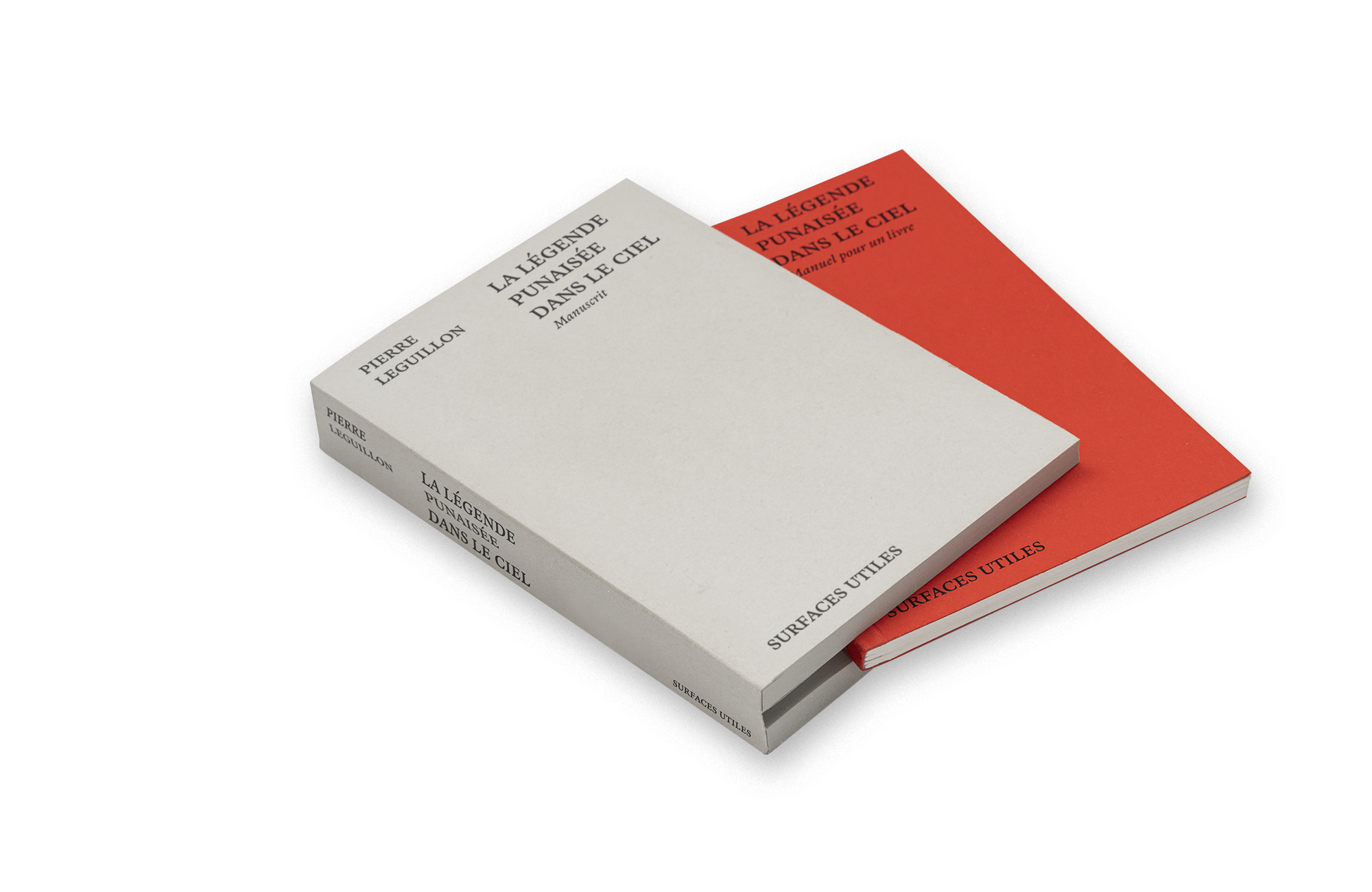 Si Surfaces Utiles promeut une hétérogénéité de pratiques artistiques, littéraires et typographiques, chaque nouvelle publication est aussi pour la maison d’édition l’occasion de chercher des modèles économiques alternatifs à l’industrie de l’édition, en complicité avec ses acteurs, et notamment par l’appropriation et le détournement des processus d’impressions standardisés. Ce sont les disponibilités matérielles — du papier stocké depuis parfois de longues années et deux techniques d’impression différentes, offset et numérique, que l’imprimeur Jan De Meester a mis à notre disposition en jouant le jeu de Surfaces Utiles — qui ont donc déterminé la forme de cette Légende punaisée dans le ciel.