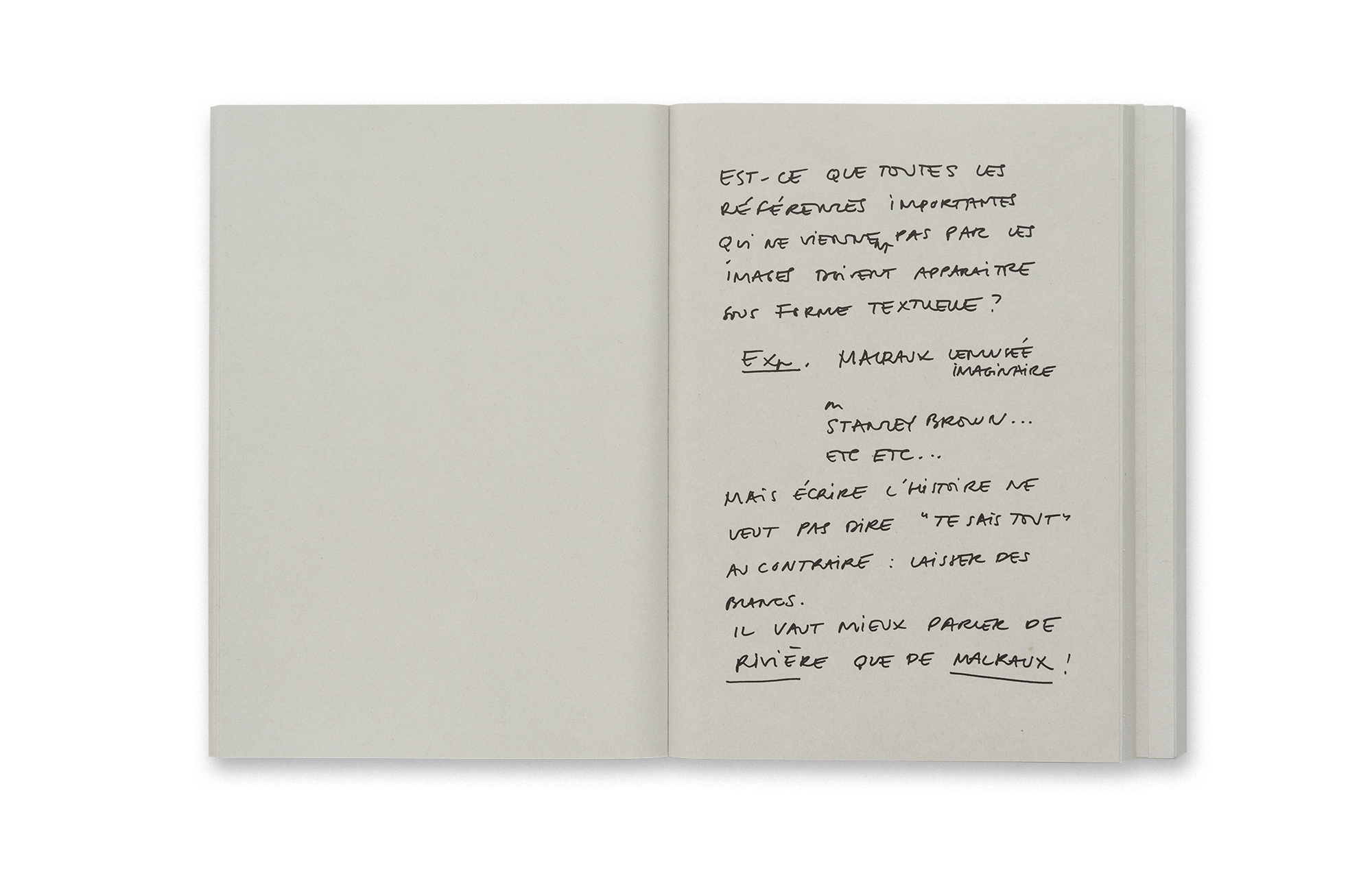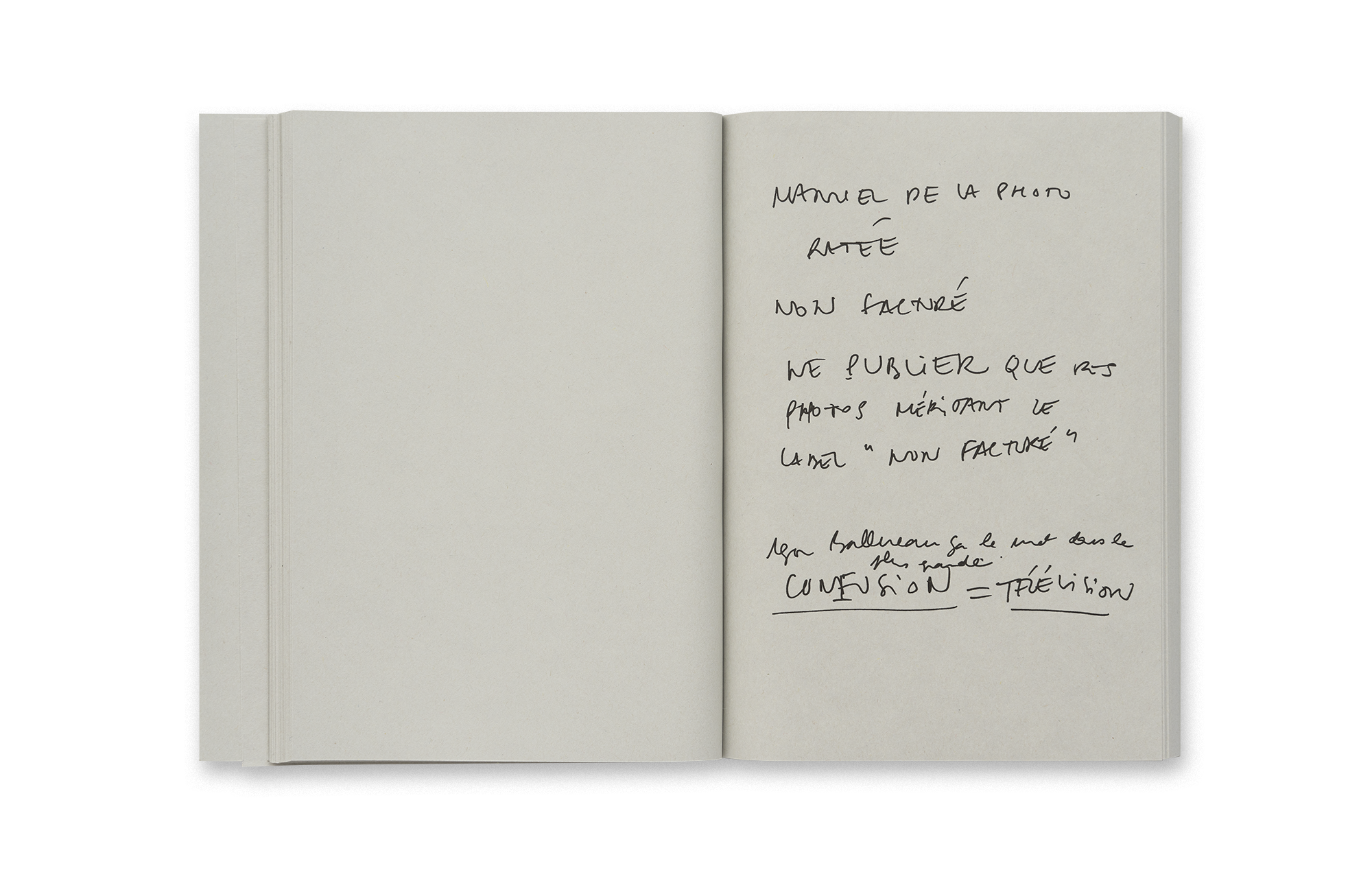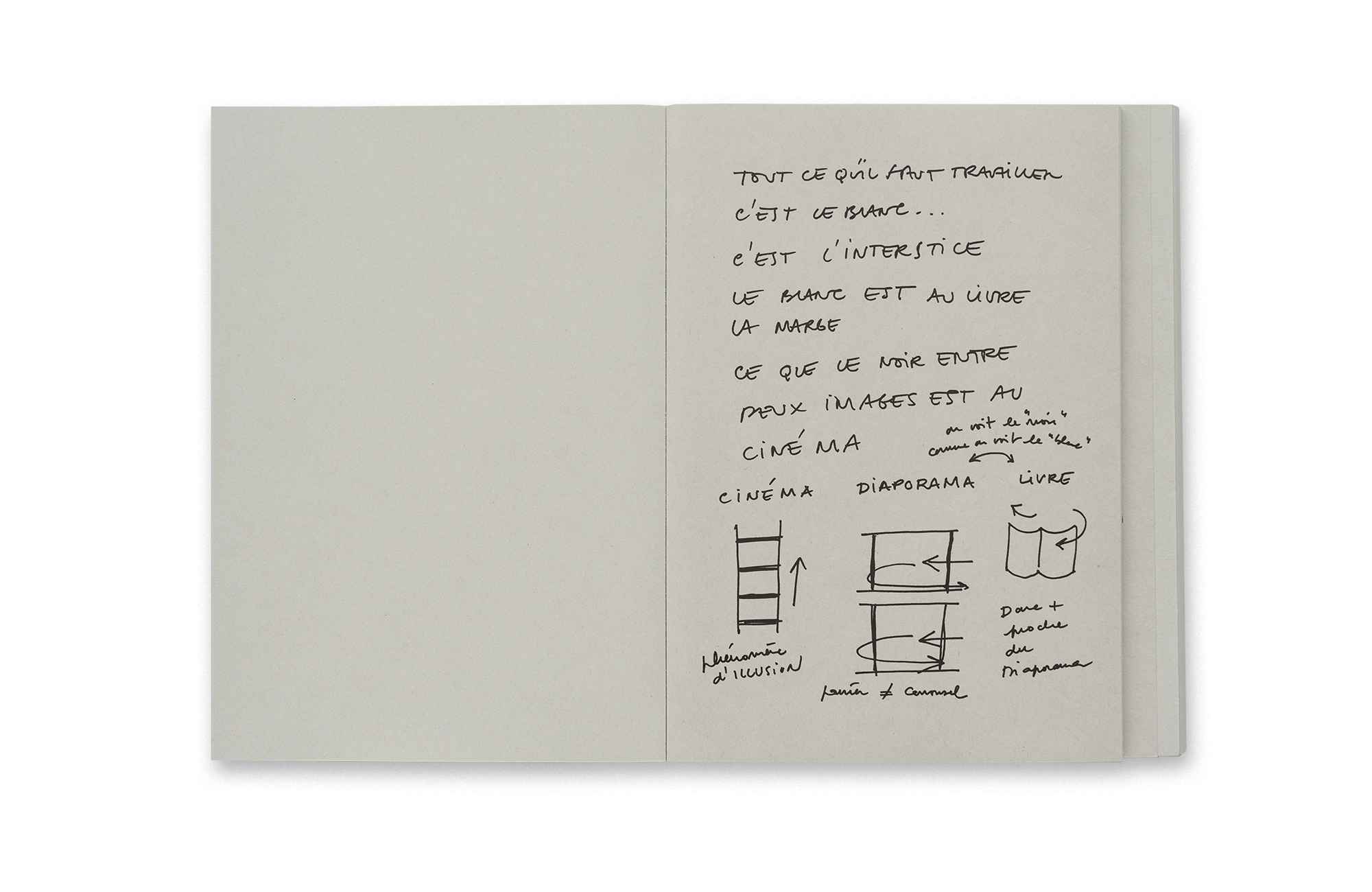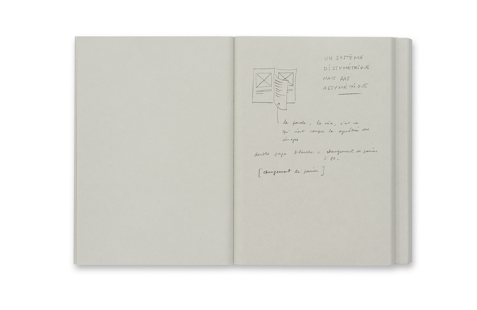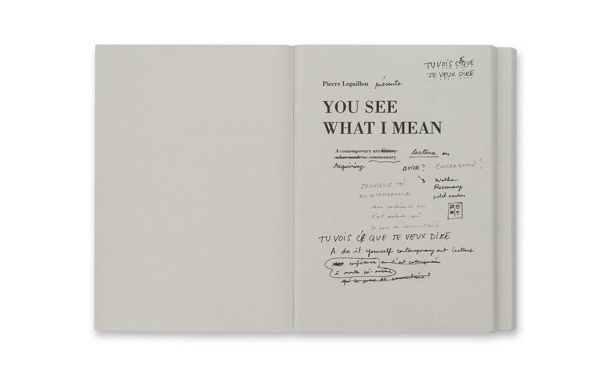 This volume contains a few transcribed notes about the making of a book. Pierre Leguillon wrote them during the winter of 2003–2004 while he was in residency at Villa Medici, the French Academy in Rome. During that winter, the artist remained cloistered in his home for a few weeks, detached. He looked for the right form for the book, which had to translate a slideshow of images and sound into the space of some pages. Leguillon was familiar with the medium of the slideshow. He had used it for the past ten years or so. Late at night or just out of bed, he would put down peremptory and seemingly conclusive formulas. He would almost always use a felt-tip pen, writing in capital letters.