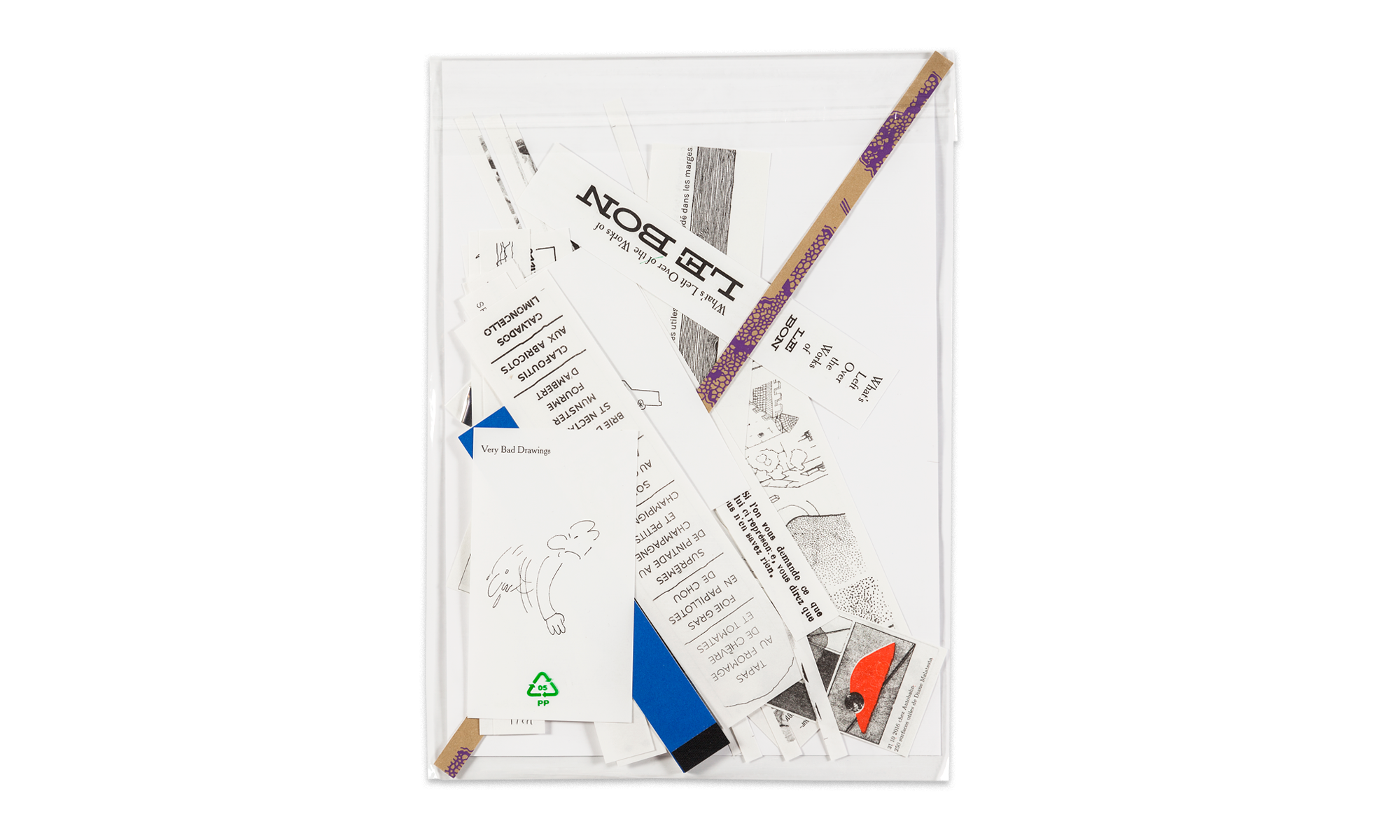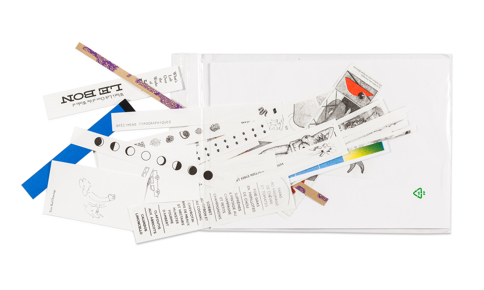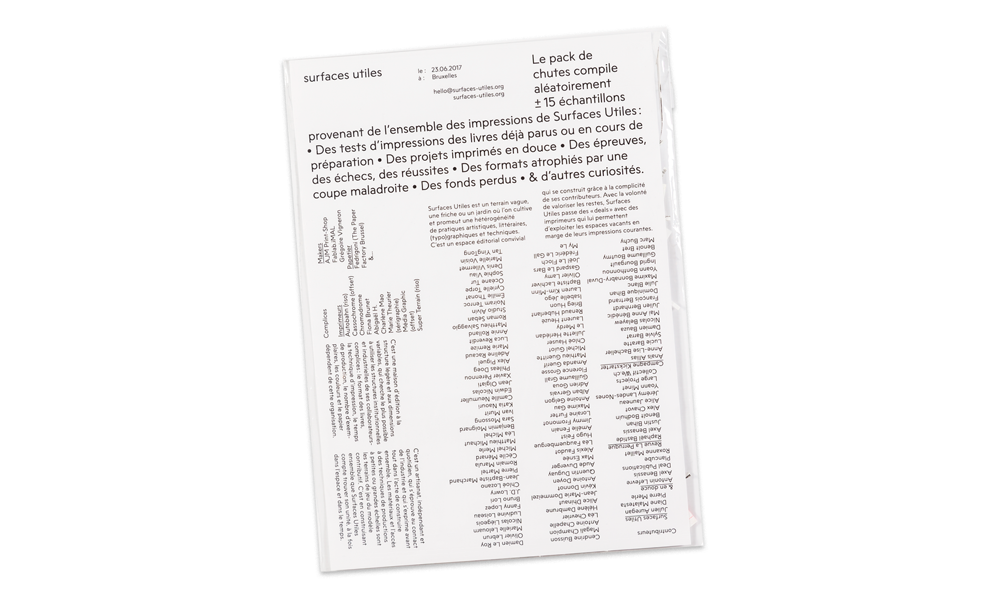 Le pack de chutes compile aléatoirement une douzaine d'échantillons provenant de l'ensemble des impressions de Surfaces Utiles : des tests d'impressions de livres déjà parus ou en cours de préparation ; des projets imprimés en douce ; des épreuves, des échecs, des réussites ; des formats atrophiés par une coupe maladroite ; des fonds perdus ; & d'autres curiosités.