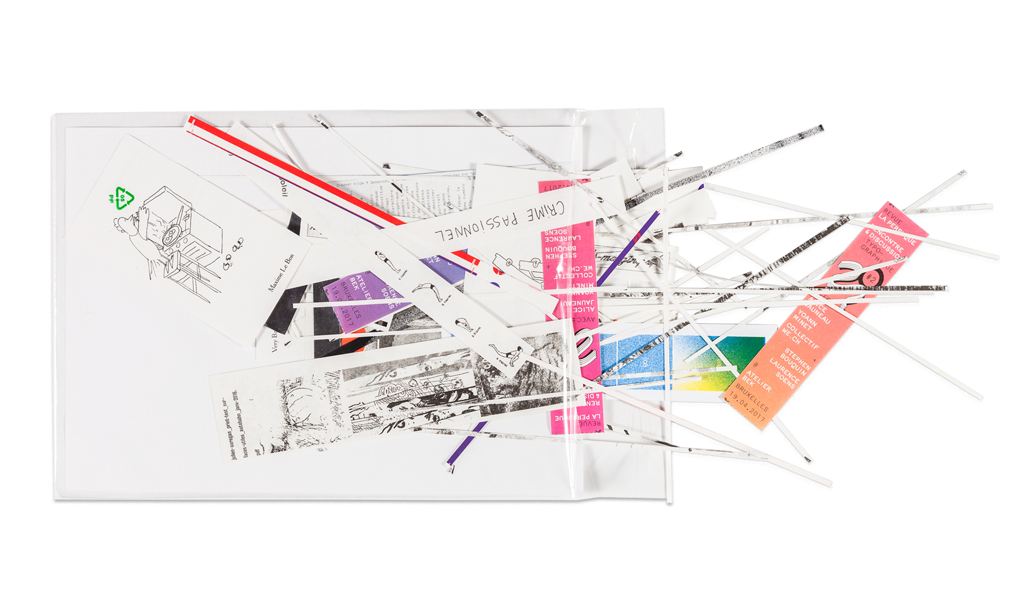 This “leftovers package” compiles a dozen of random samples extracted from all the prints of Surfaces Utiles : some printing-tests for books already published or work in progress; some proof sheets, failures, successes; & many others curiosities.