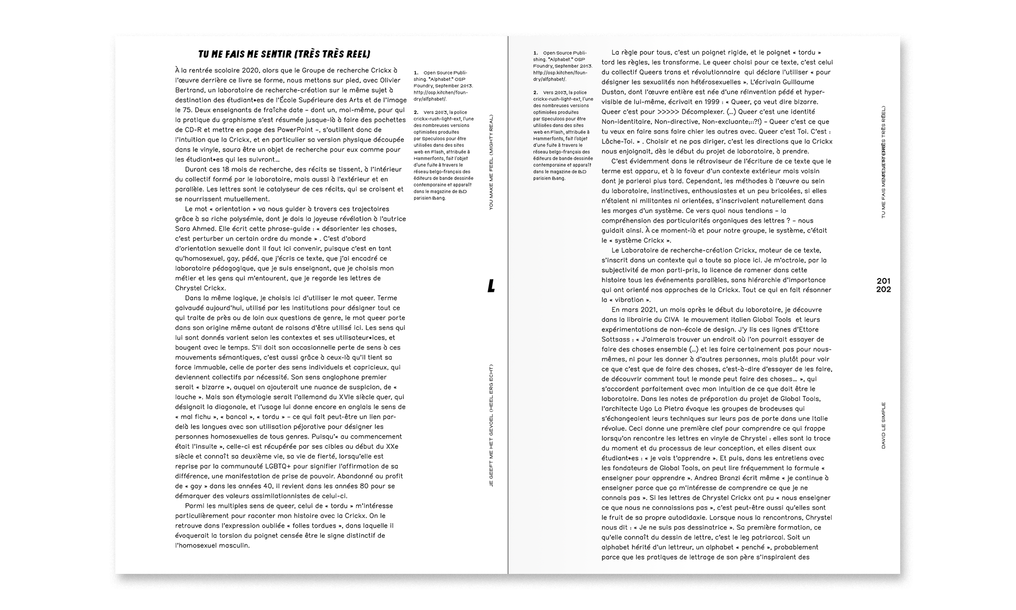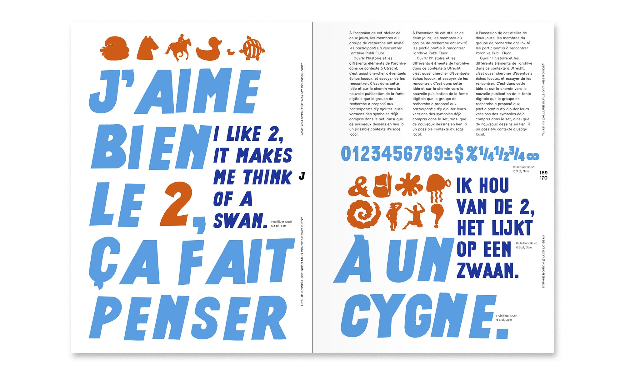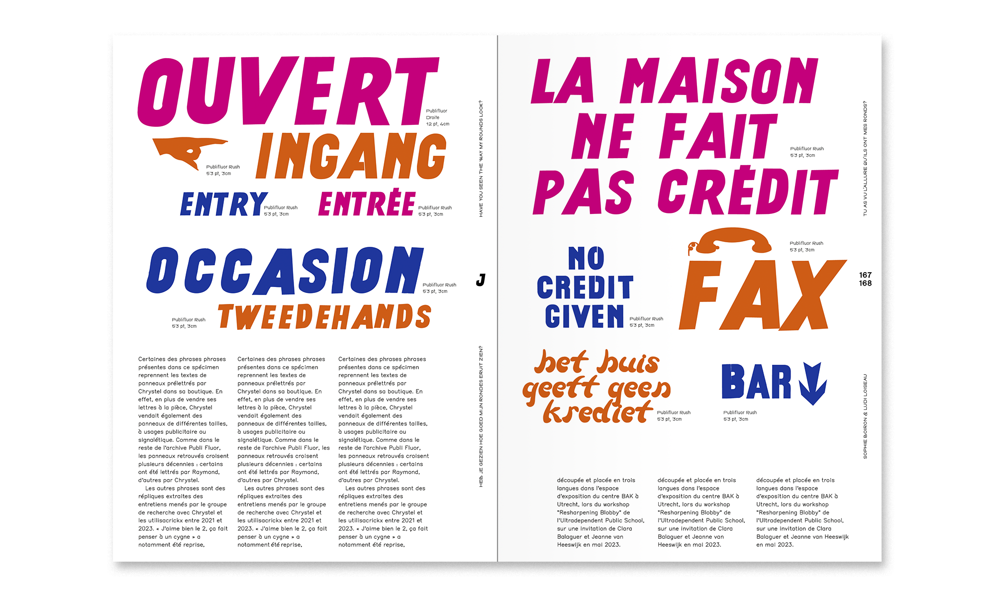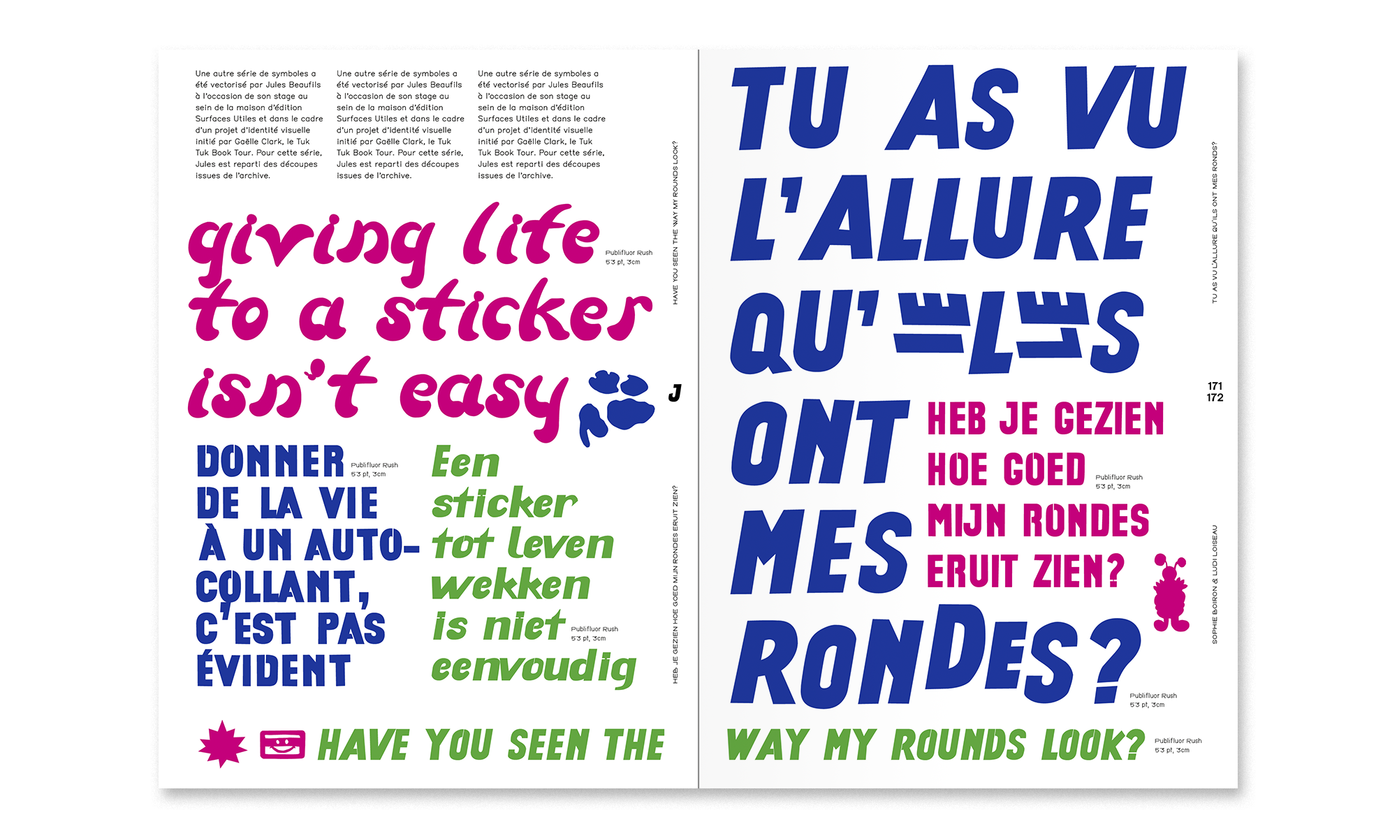 In addition to the book, the work of the Crickx research group also led to the renaming and extension of the glyph set for the digital versions of “Crickx” font, distributed by the Open Source Publishing foundry. We are delighted to announce that it is now being republished under the name Publi Fluor! You can browse the type specimen, visit the font files sources and also read some of the articles published in the book her: publifluor.osp.kitchen