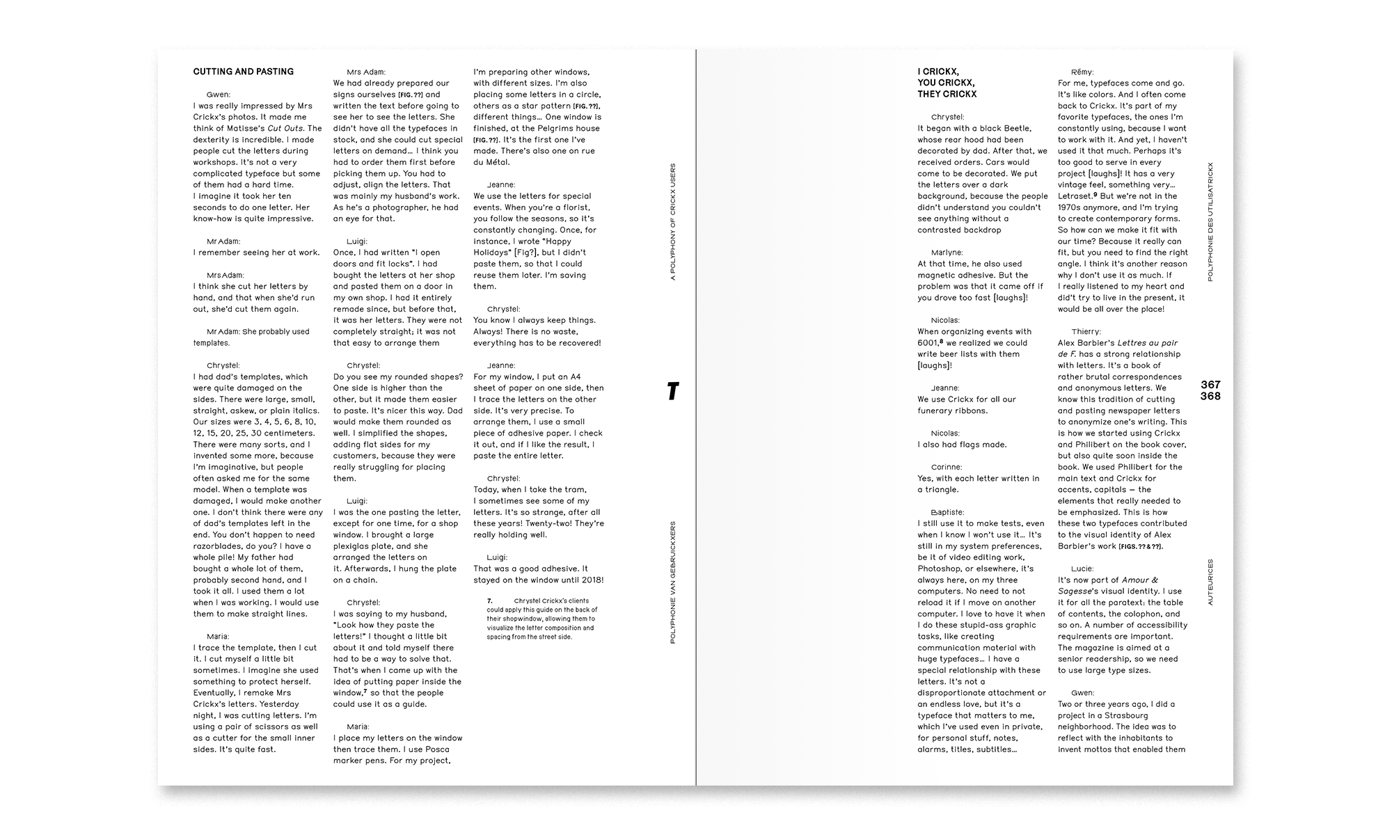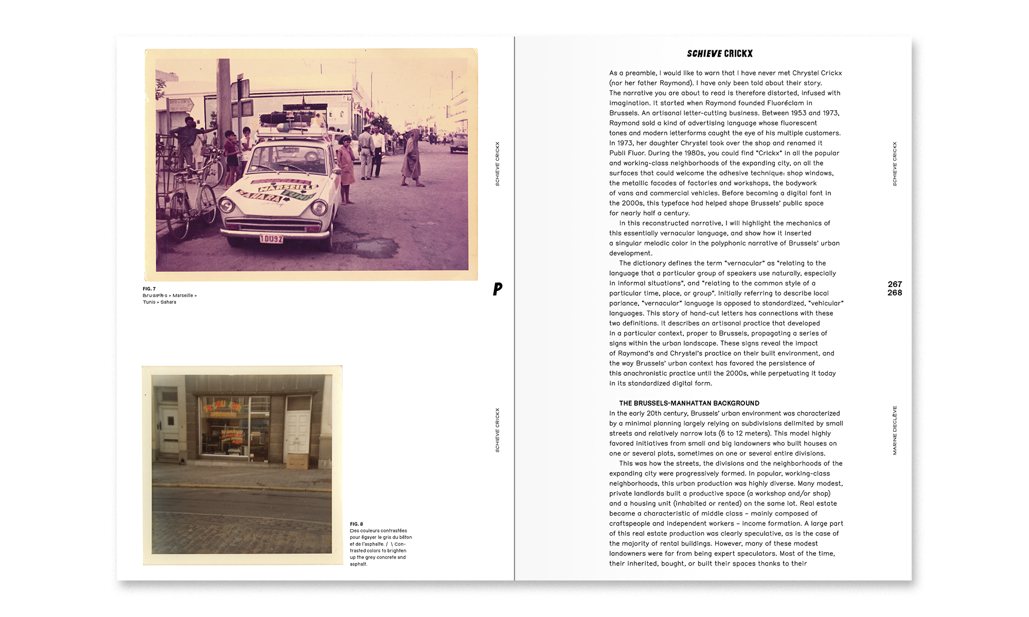 On the fringes of standardized communication, the letterforms have contributed and continue to contribute to the urban visual environment in Brussels and beyond. This non-standard collective essay attempts to tell the life of a type model, its successive authors and their tools, all while broadening the field and exploring the interstices between the many stories that Chrystel Crickx’s practice gave rise to.