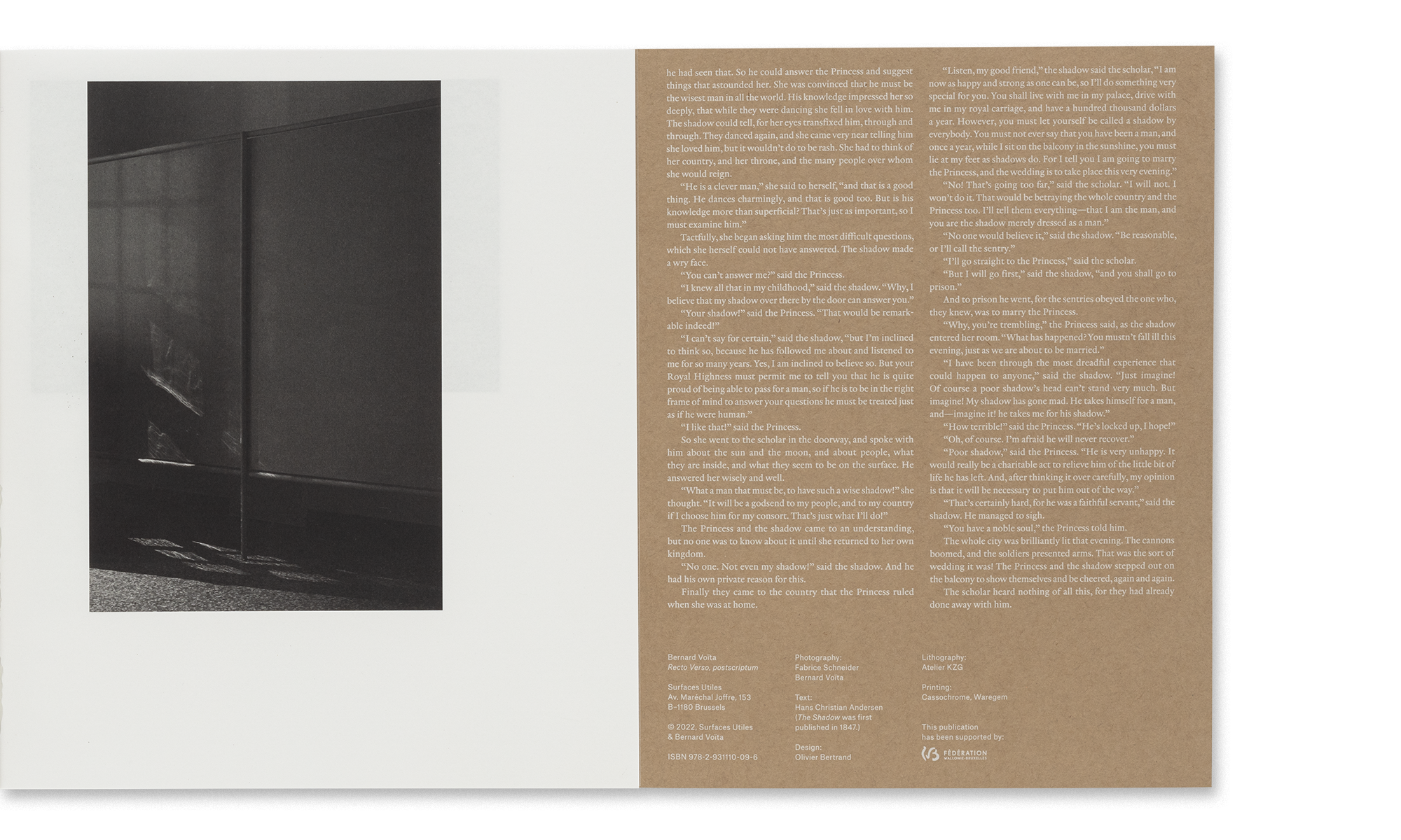 Recto Verso postscriptum met en dialogue et à valeur égale les deux temps de cette même exposition de Bernard Voïta : celle, ouverte au public du 11 août au 21 octobre, photographiée en couleur et son fantôme photographié plus tôt, en noir et blanc, entre le 10 et le 14 avril 2018. La confrontation systématique de ces deux moments nous invite continuellement à réévaluer notre point de vue en tant que spectateur d'une exposition réinventée par le biais de son archive. L'Ombre, le conte d'Andersen reproduit pour l'occasion dans ce livre d'artiste, contribue à entretenir cette ambiguïté.