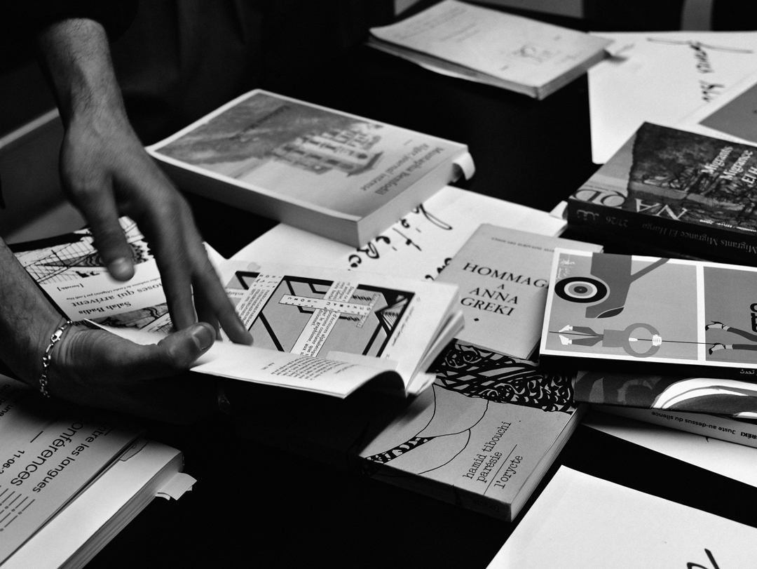 Walid Bouchouchi is a graphic designer, typographer and author. Born in Algiers in 1989, he studied graphic design at the École Supérieure des Beaux-Arts of Algiers, then aesthetics and contemporary art practice at Paris 8 University. After several experiences in agencies, he founded Akakir Studio in 2017 and has since provided graphic support to museums, publishing houses, festivals and other cultural institutions in Europe, North Africa and the Middle East. His sensitivity to multilingualism and multiple writing systems—stemming from the Algerian context in which he grew up, and later nourished by his work within the diaspora—became the core of his research, titled Polyscript.