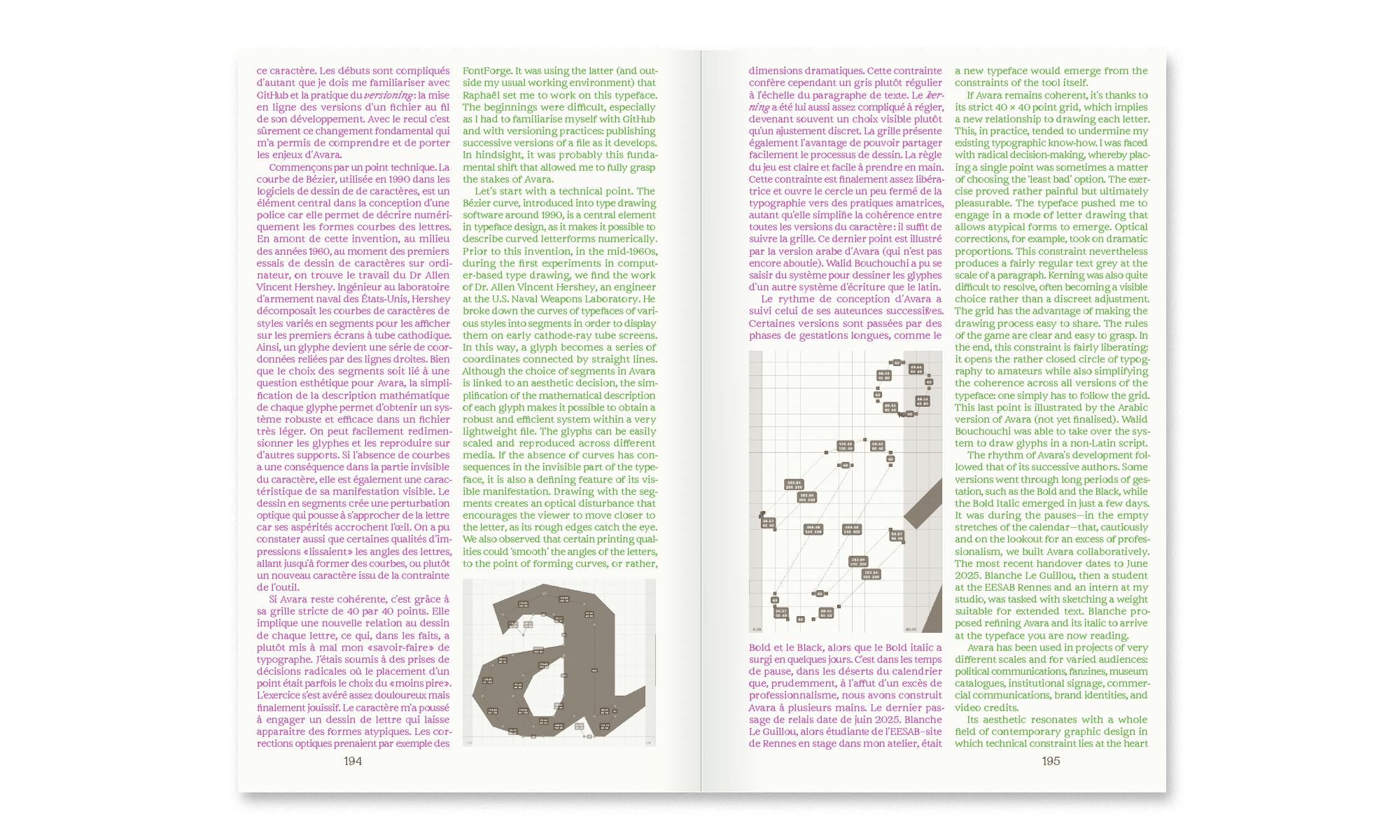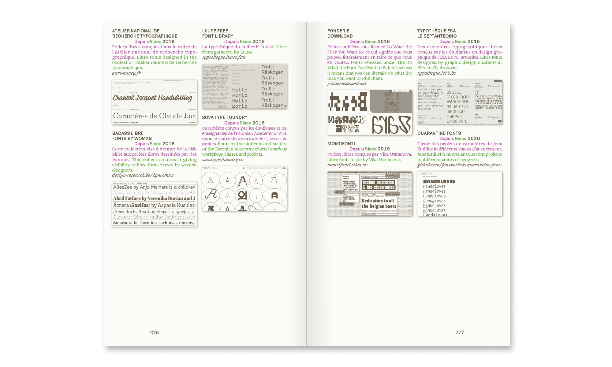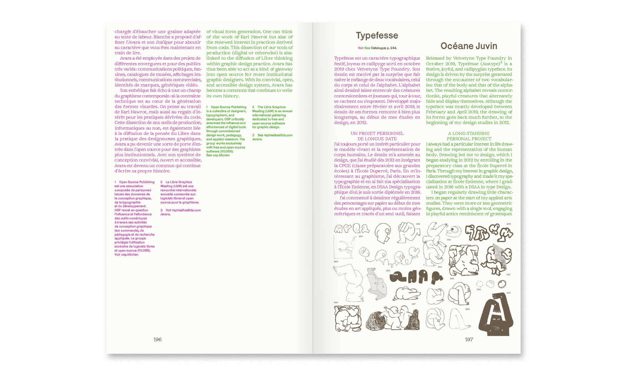 The book is structured around a polyphonic interview conducted by Sandra Chamaret with the members of the collective, a series of in-depth articles on emblematic typefaces from the foundry, as well as an exhaustive catalogue of the more than 70 fonts published by nearly as many international authors.