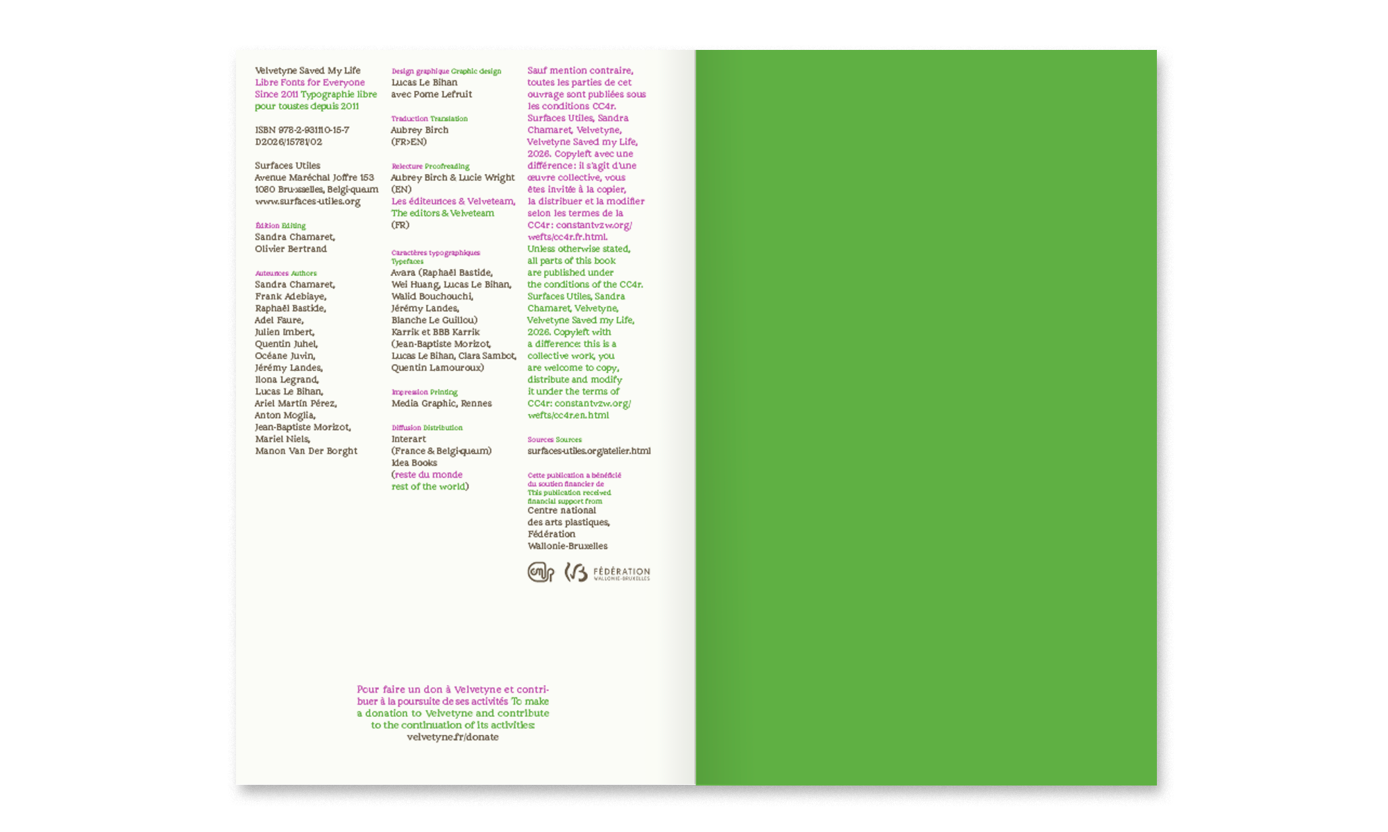 This monograph celebrates a generous collective creation—pioneering and recognized on the international scene—that continually questions and reinvents itself. Velvetyne Saved My Life reveals the distinctive workings of this unconventional structure within the contemporary type foundry landscape, its commitment to free-culture and open-source principles, its singular editorial policy, and its pedagogical practice.