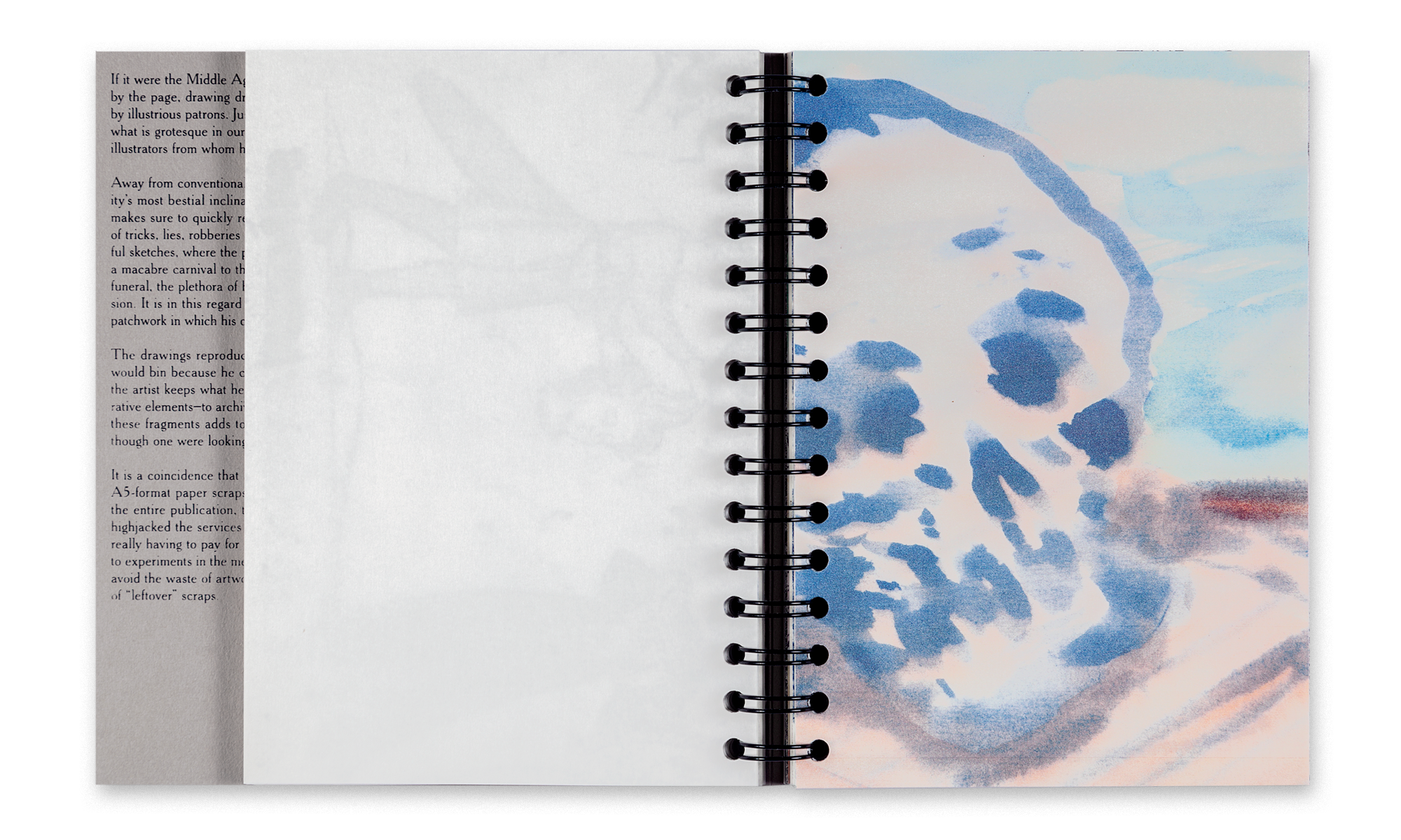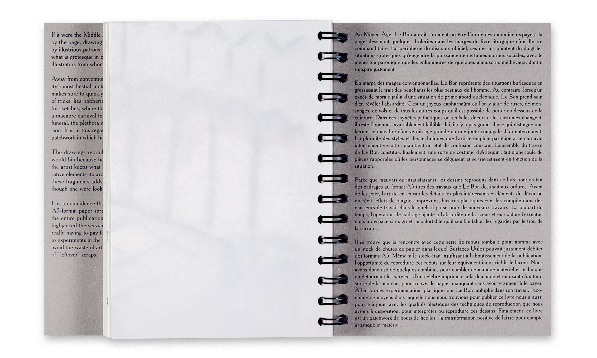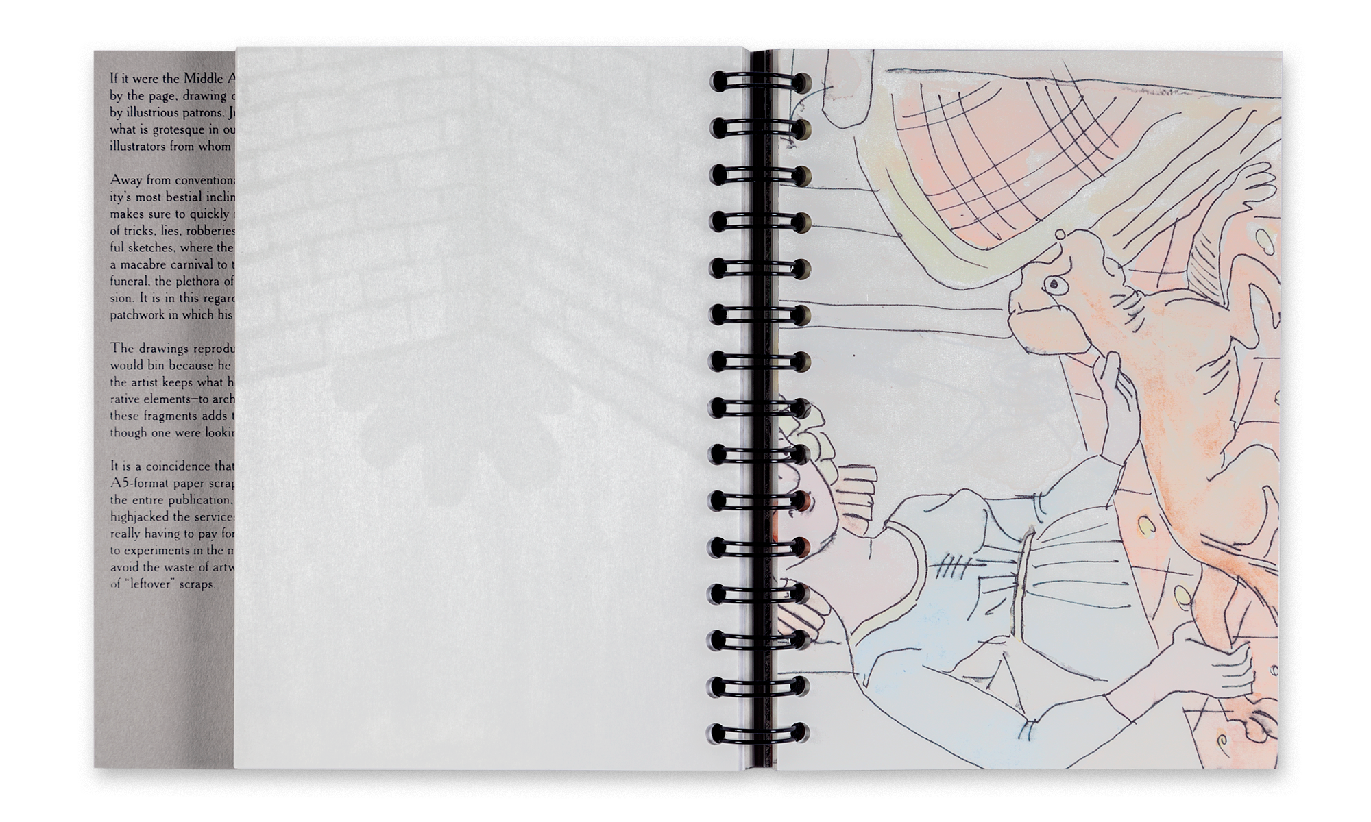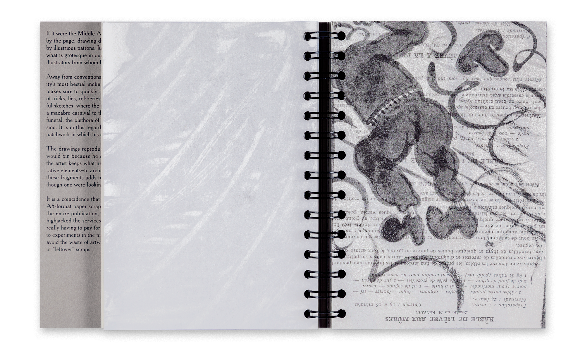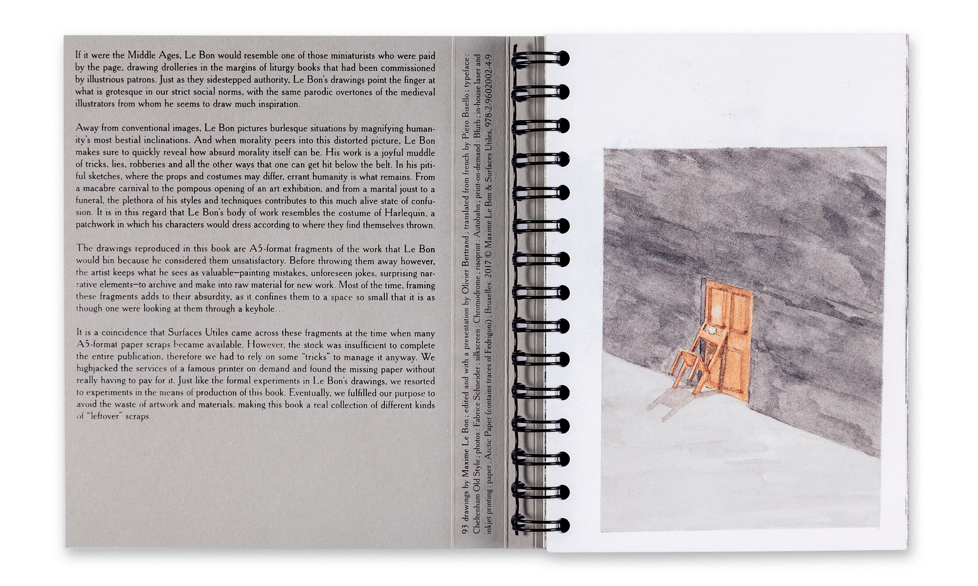 The drawings reproduced in this book are A5-format fragments of the work that Le Bon would bin because he considered them unsatisfactory. Before throwing them away however, the artist keeps what he sees as valuable—painting mistakes, unforeseen jokes, surprising narrative elements—to archive and make into raw material for new work.