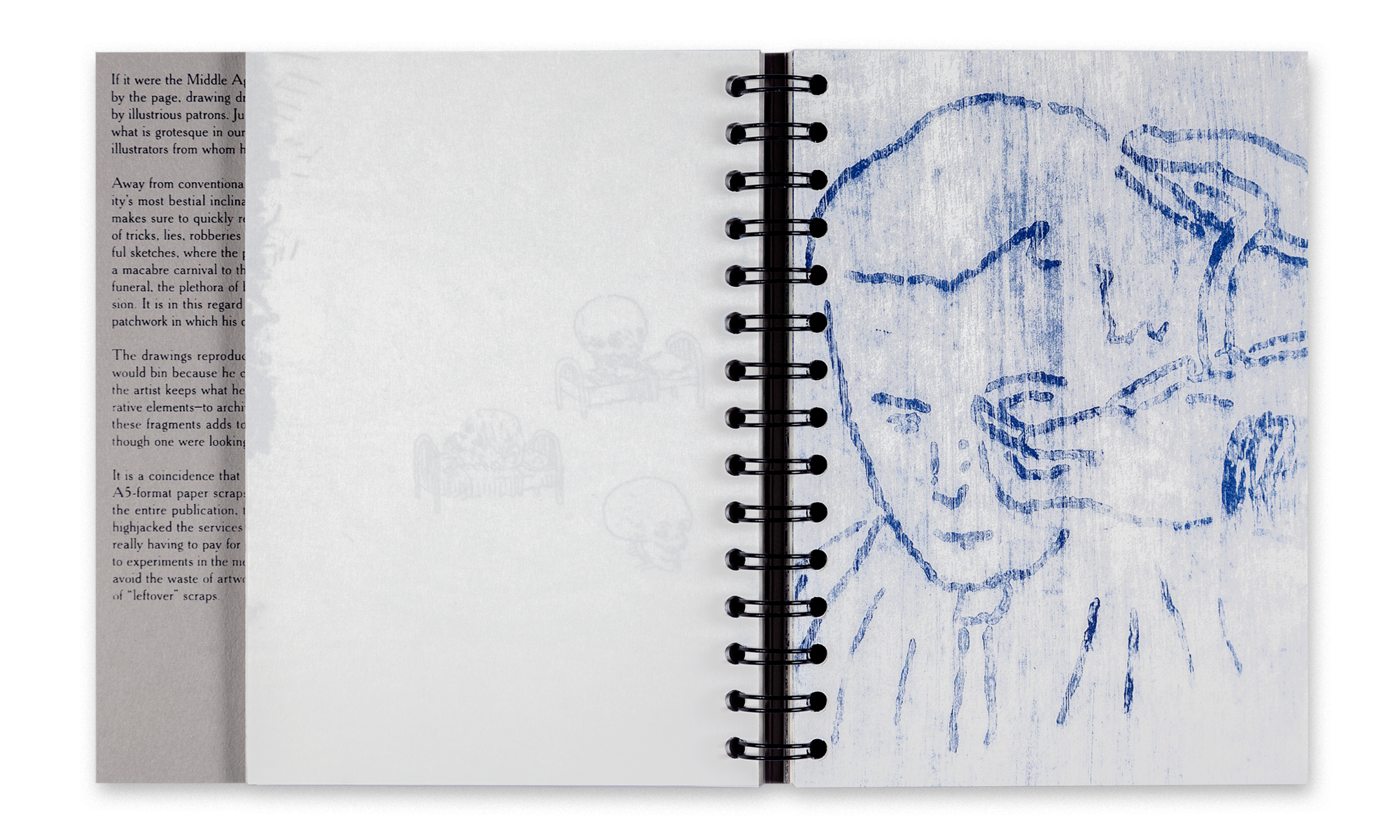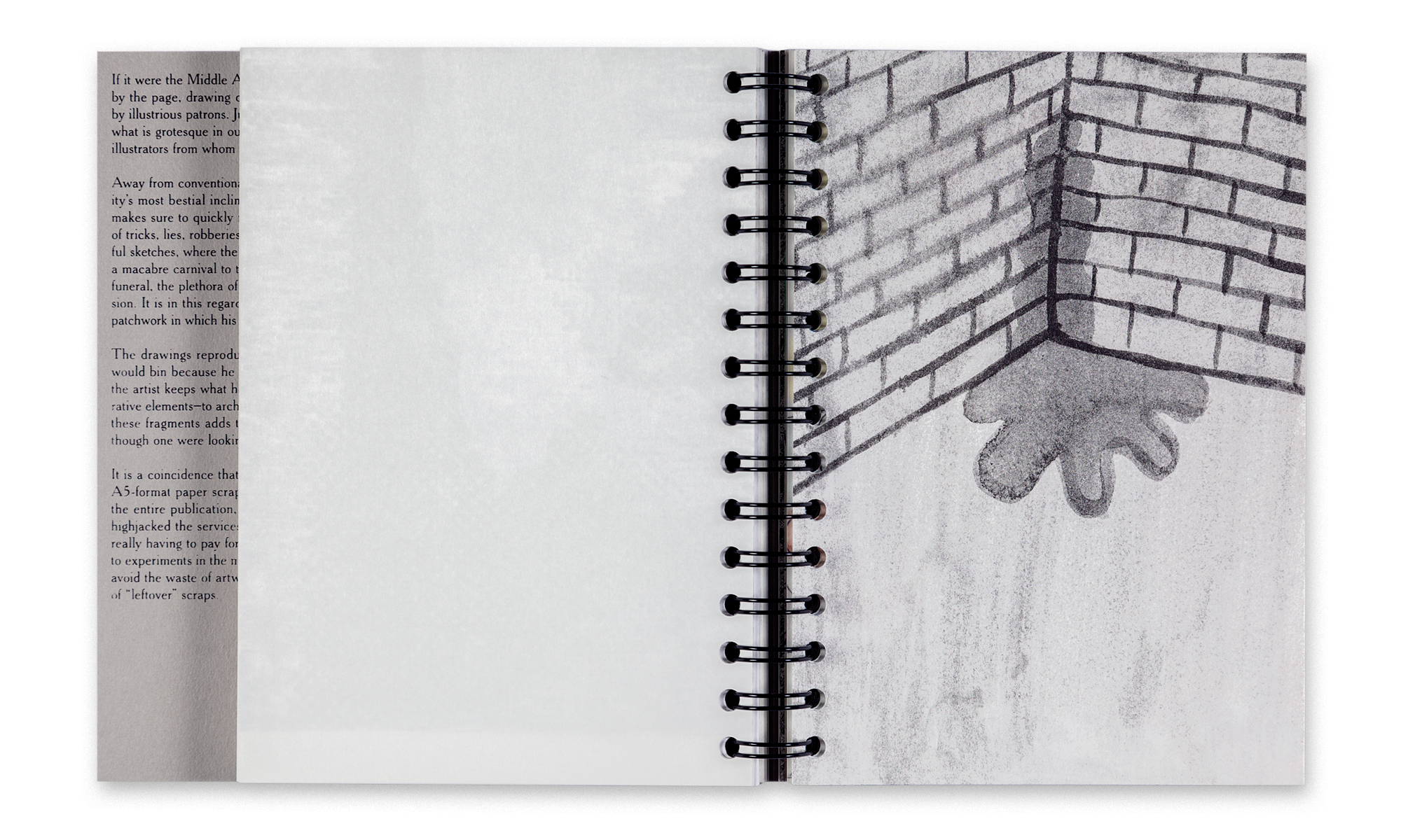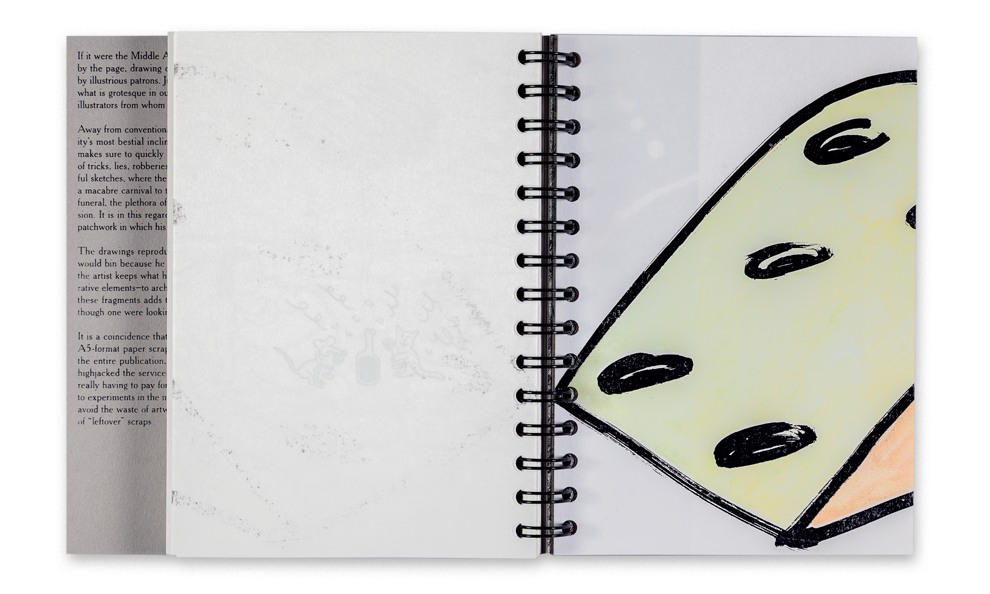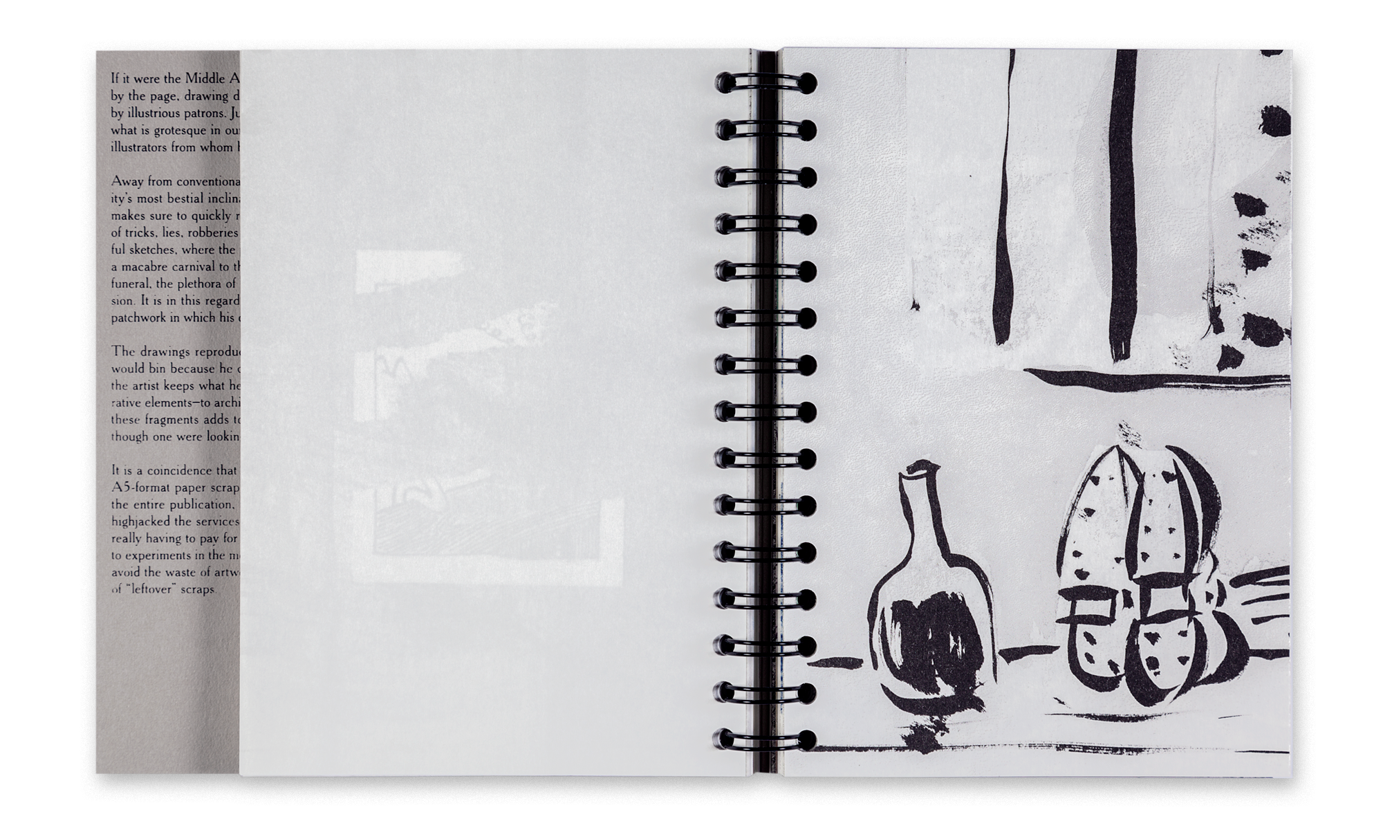 The drawings reproduced in this book are A5-format fragments of the work that Le Bon would bin because he considered them unsatisfactory. Before throwing them away however, the artist keeps what he sees as valuable—painting mistakes, unforeseen jokes, surprising narrative elements—to archive and make into raw material for new work.
