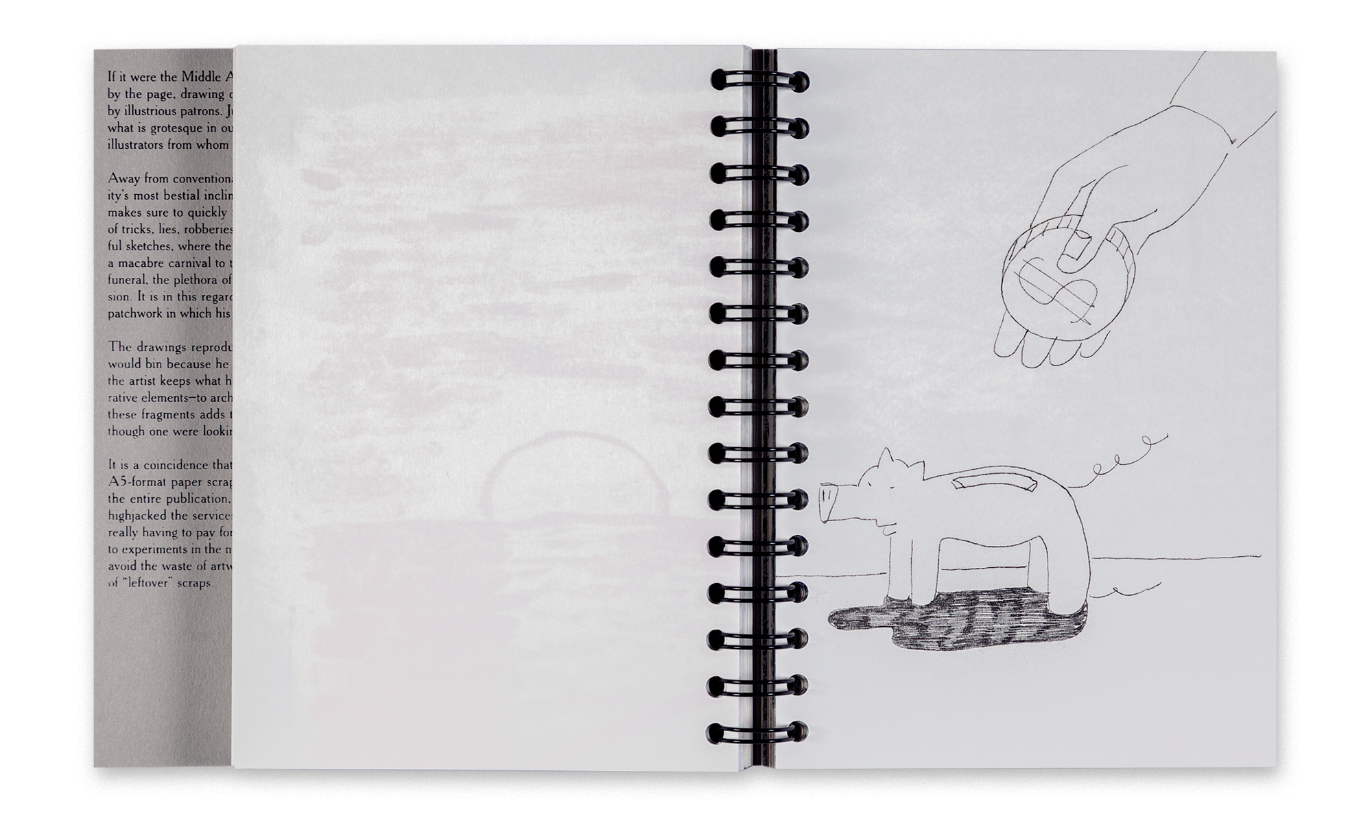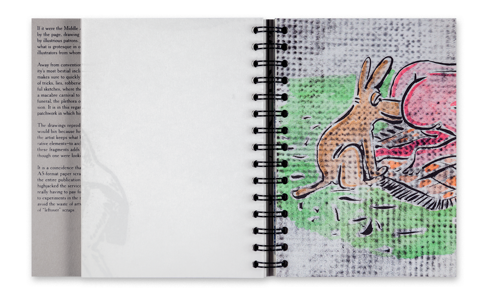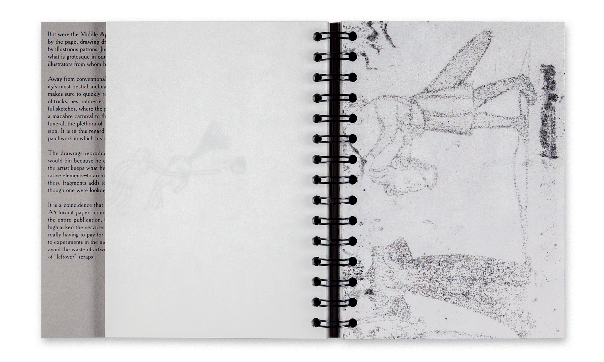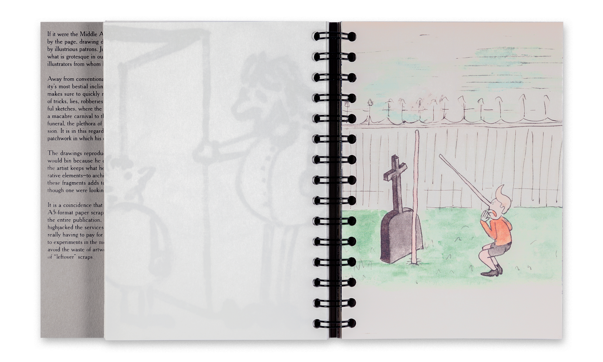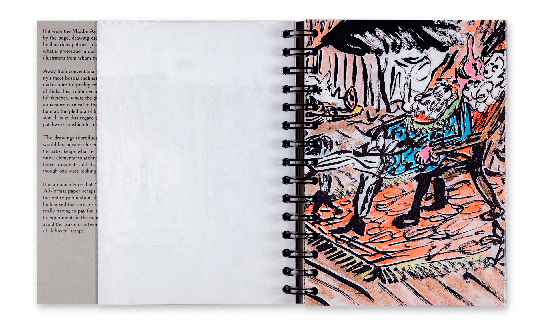 The drawings reproduced in this book are A5-format fragments of the work that Le Bon would bin because he considered them unsatisfactory. Before throwing them away however, the artist keeps what he sees as valuable—painting mistakes, unforeseen jokes, surprising narrative elements—to archive and make into raw material for new work.