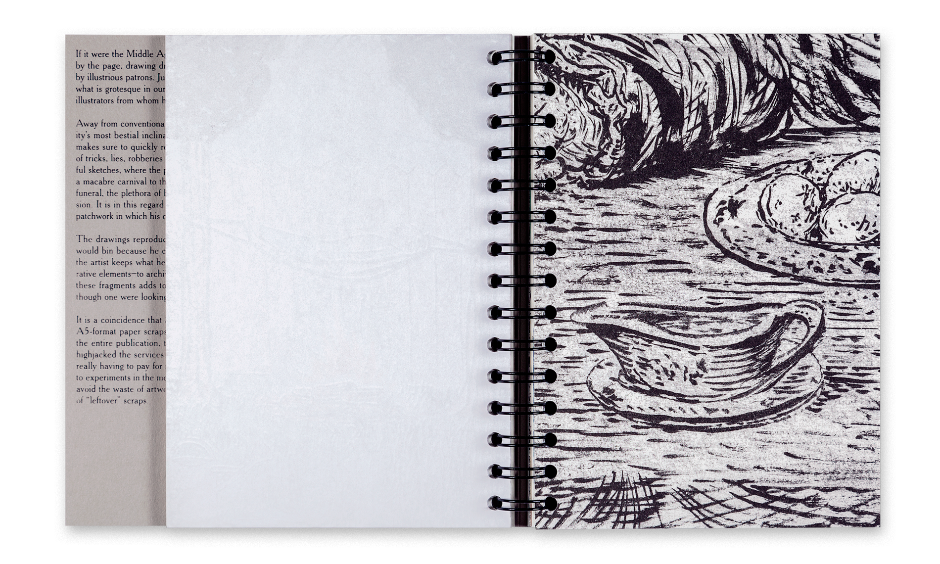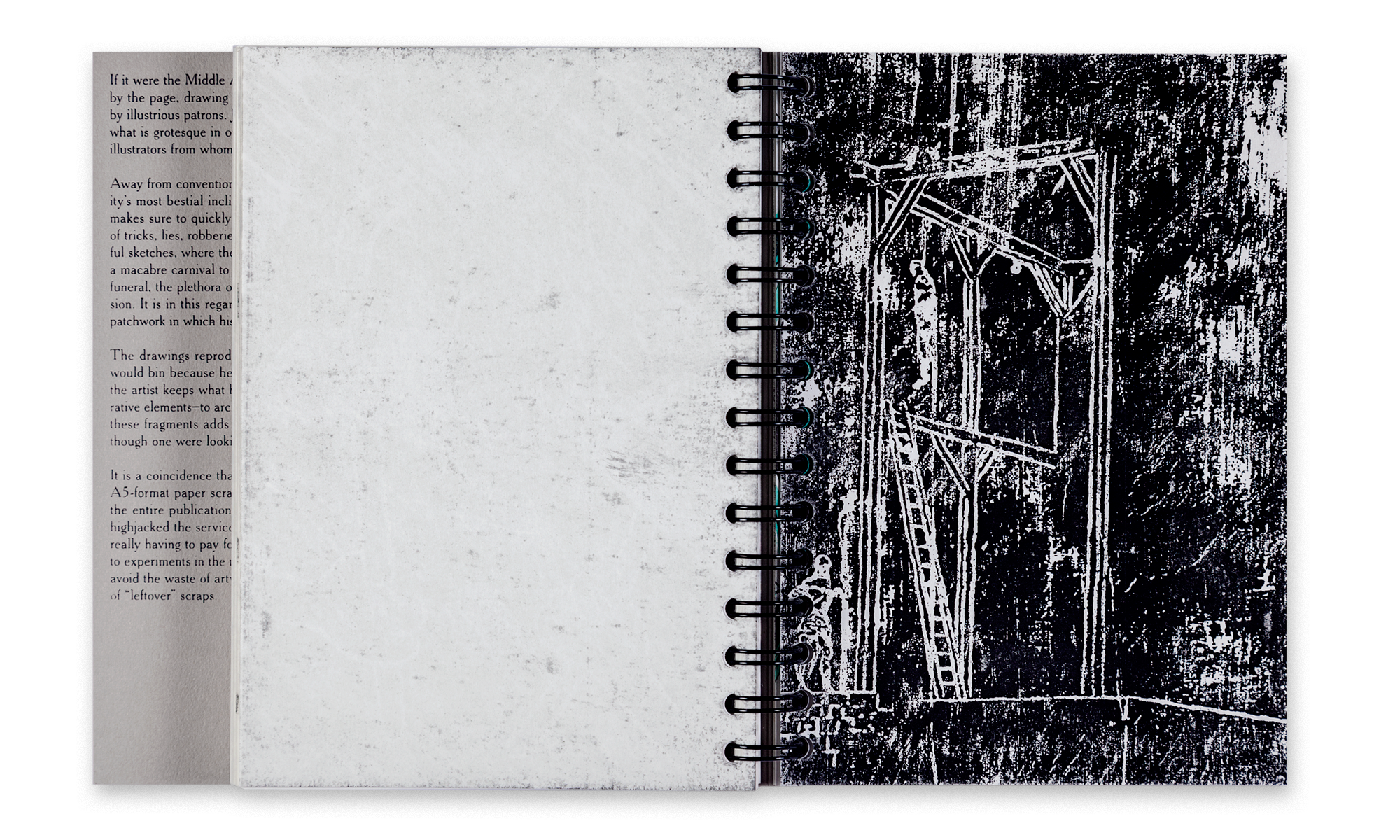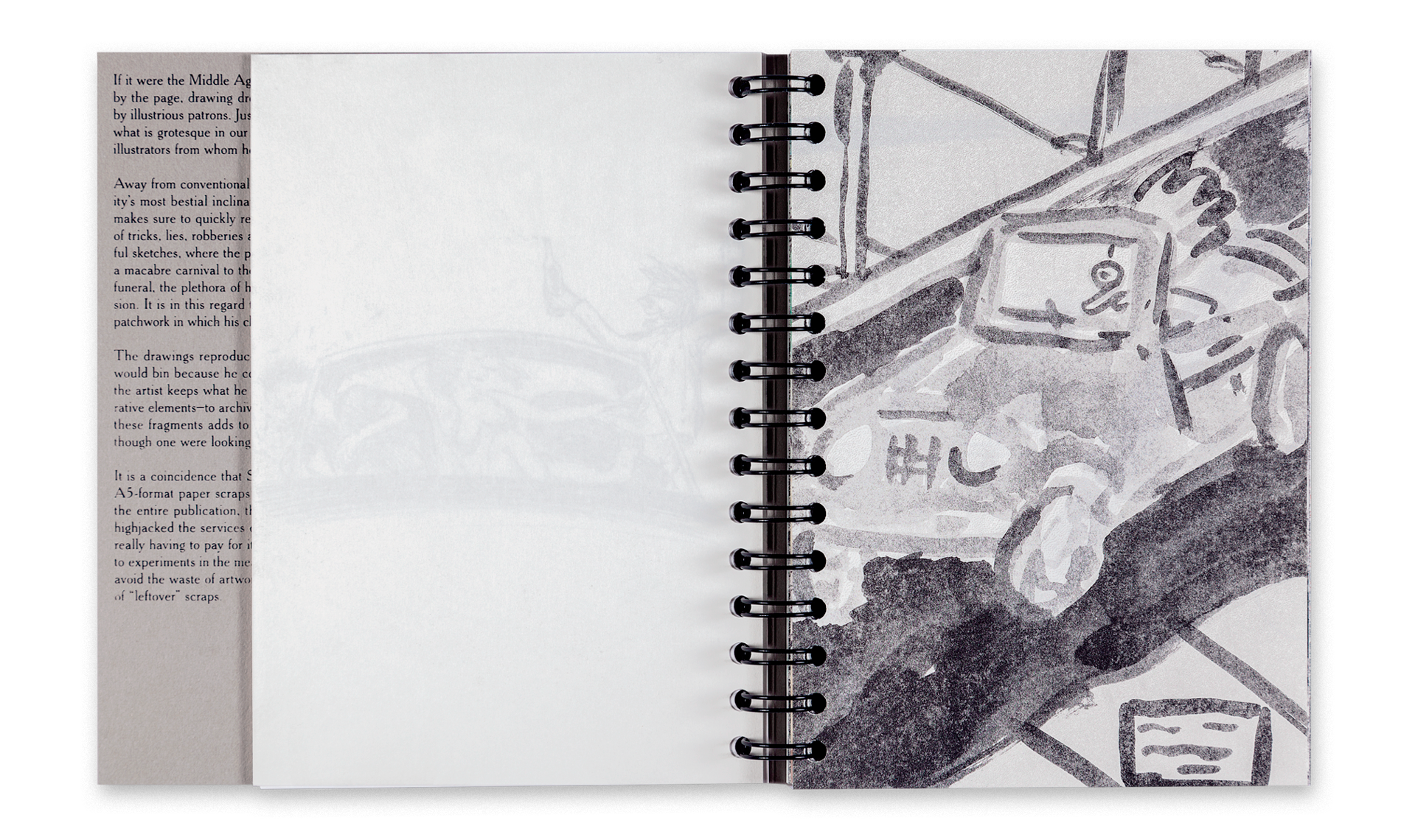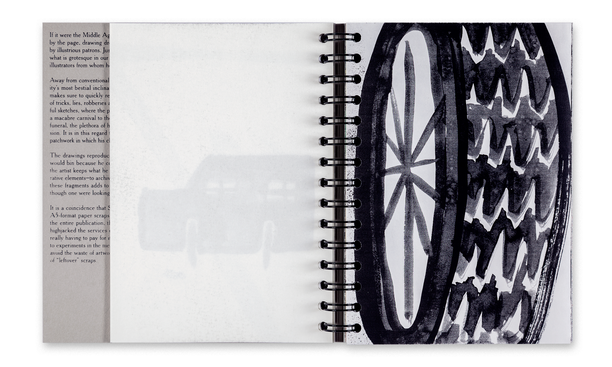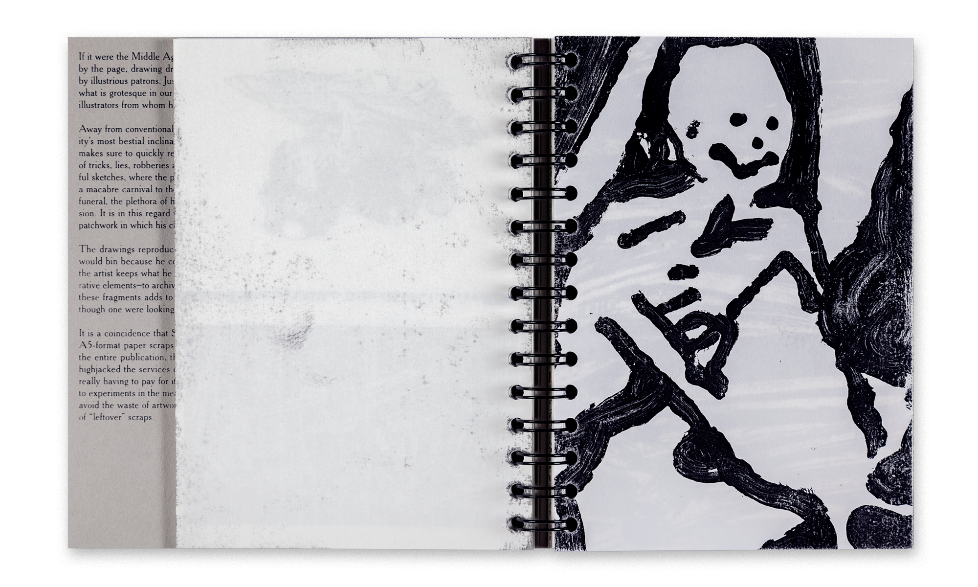 The drawings reproduced in this book are A5-format fragments of the work that Le Bon would bin because he considered them unsatisfactory. Before throwing them away however, the artist keeps what he sees as valuable—painting mistakes, unforeseen jokes, surprising narrative elements—to archive and make into raw material for new work.